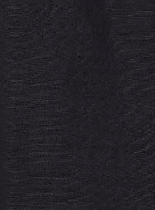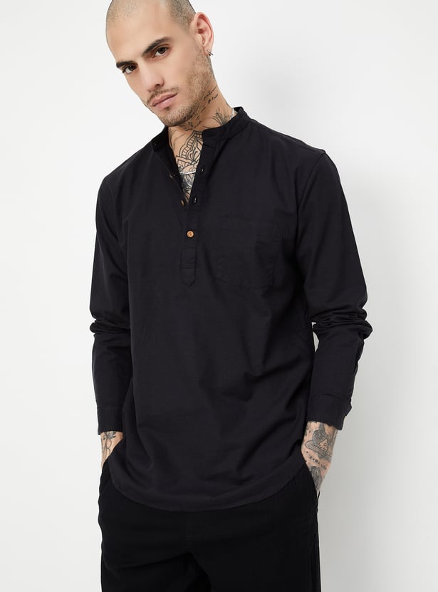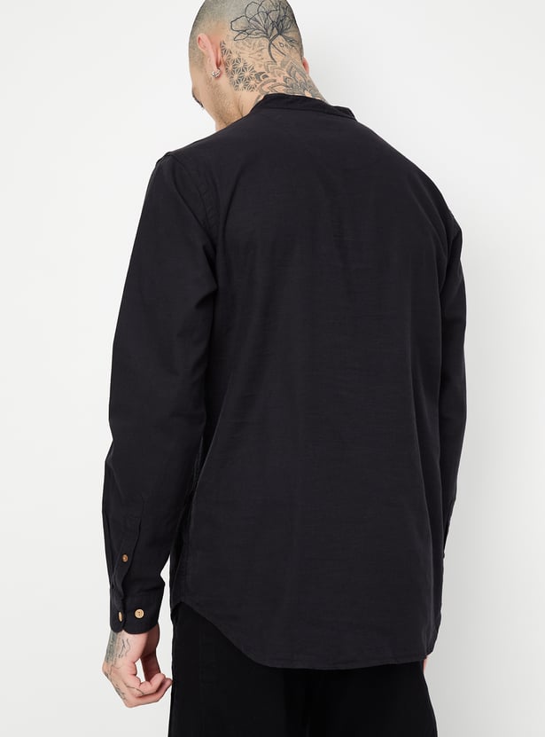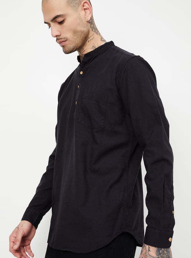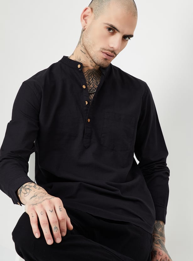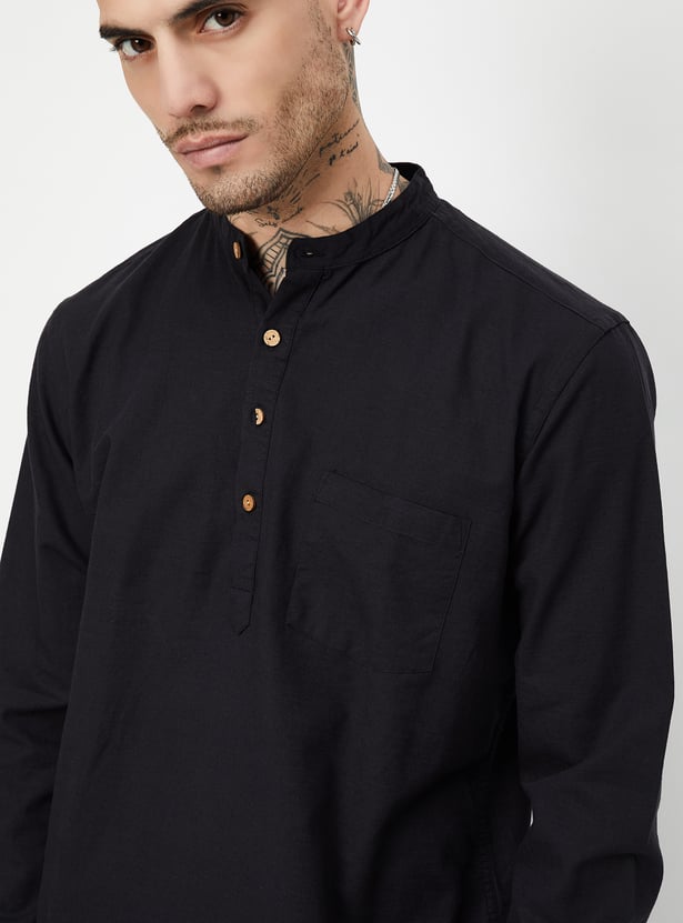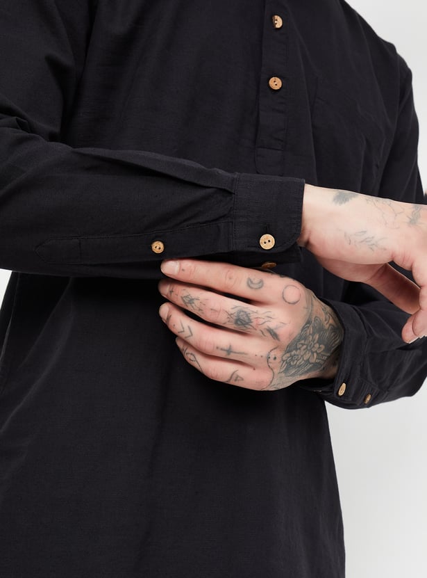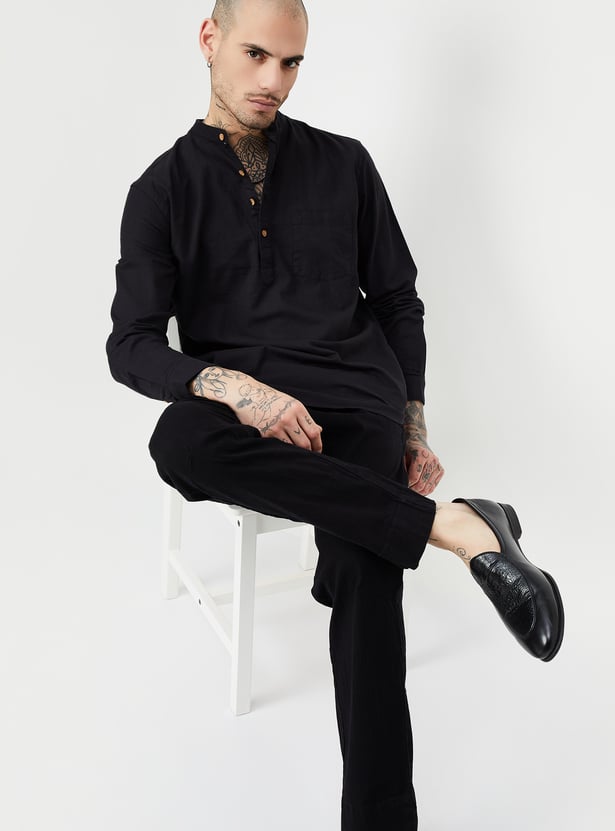 This textured slim-fit short kurta combines modern tailoring with traditional elements, featuring a button placket, a sharp band collar, and full sleeves with button cuffs. The sleek, slim fit offers a contemporary silhouette, perfect for any occasion.