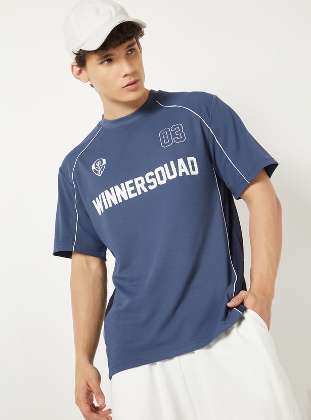 Stay active and stylish with this typography print sports T-shirt. Featuring a classic crew neck and half sleeves, it offers breathable comfort with a sporty edge
