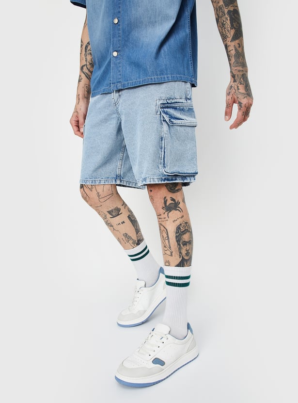 These washed cargo denim shorts combine practicality and style with cargo pockets, a button closure, and belt loops. Perfect for casual days, they offer both comfort and functionality.