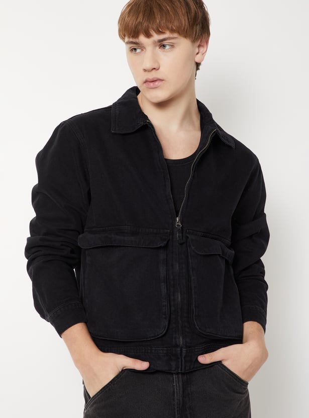 Add a rugged edge to your style with this washed denim jacket. Designed with a collared neck, zip closure, full sleeves, and flap pockets, it blends utility with timeless appeal.