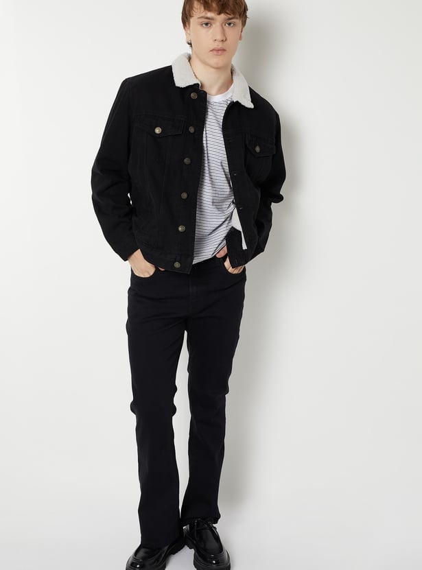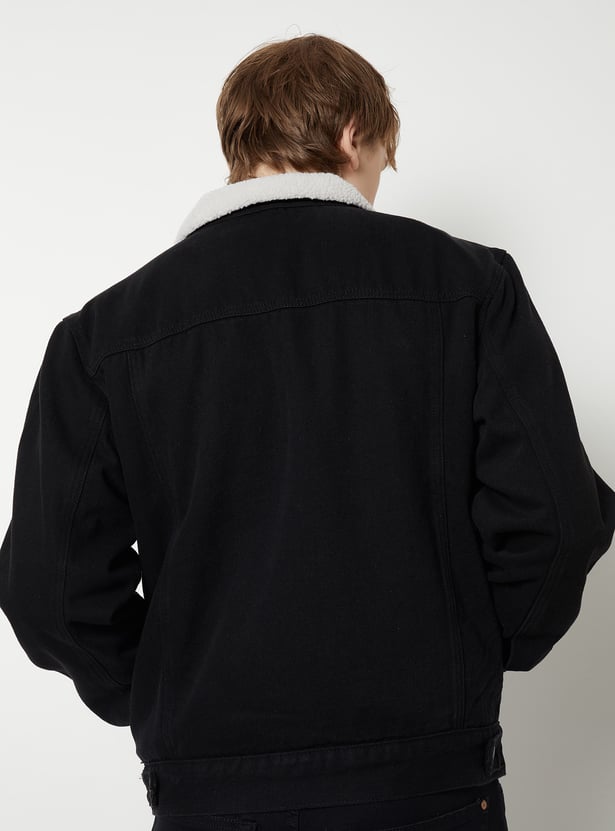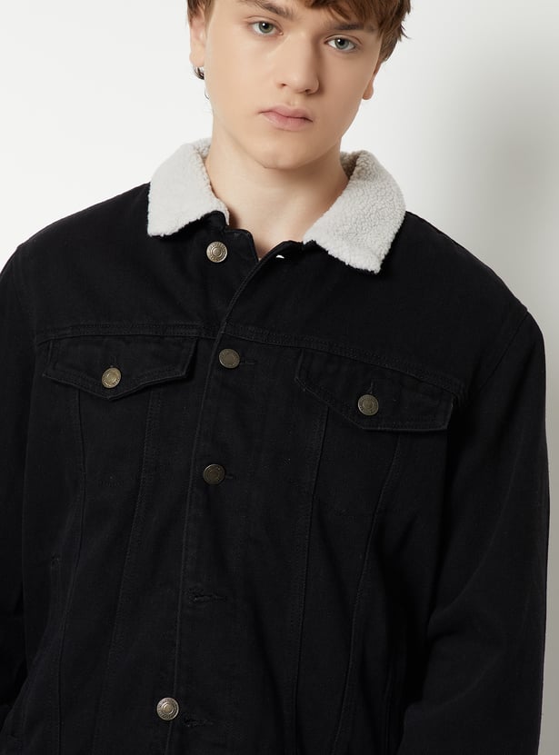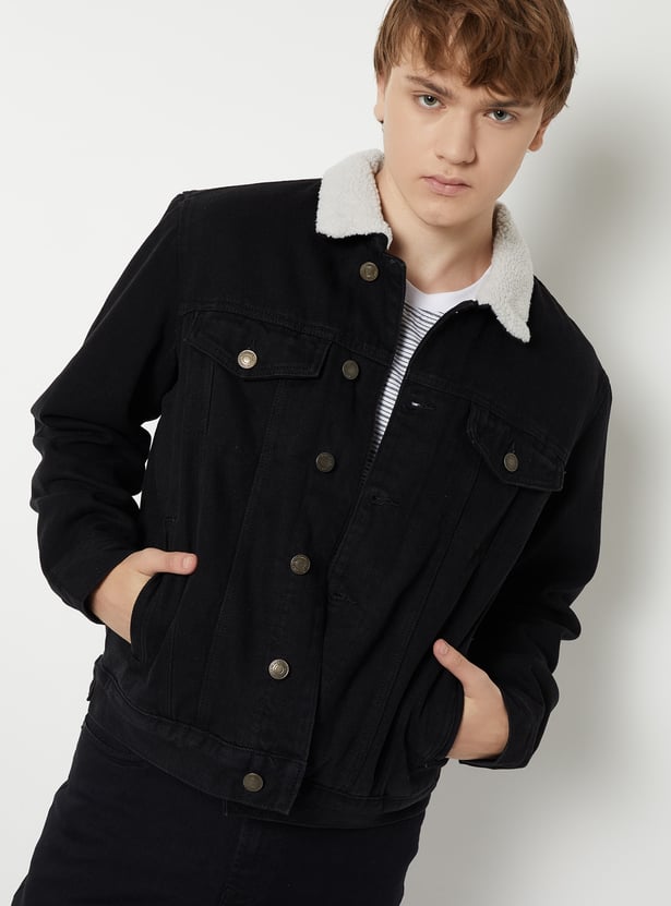 Upgrade your casual style with this washed denim jacket. Designed with a sherpa spread collar, button closure, full sleeves with button cuffs, and multiple pockets, it brings a timeless rugged charm to your wardrobe.
