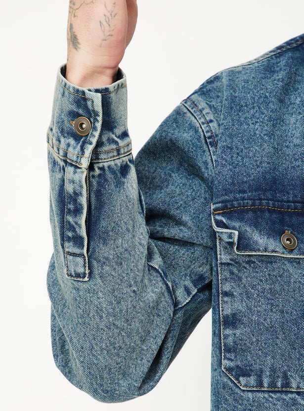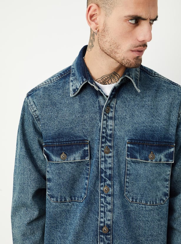 Elevate your style with this denim shacket. It features a washed finish and classic details like a spread collar, flap pockets and buttoned cuffs.