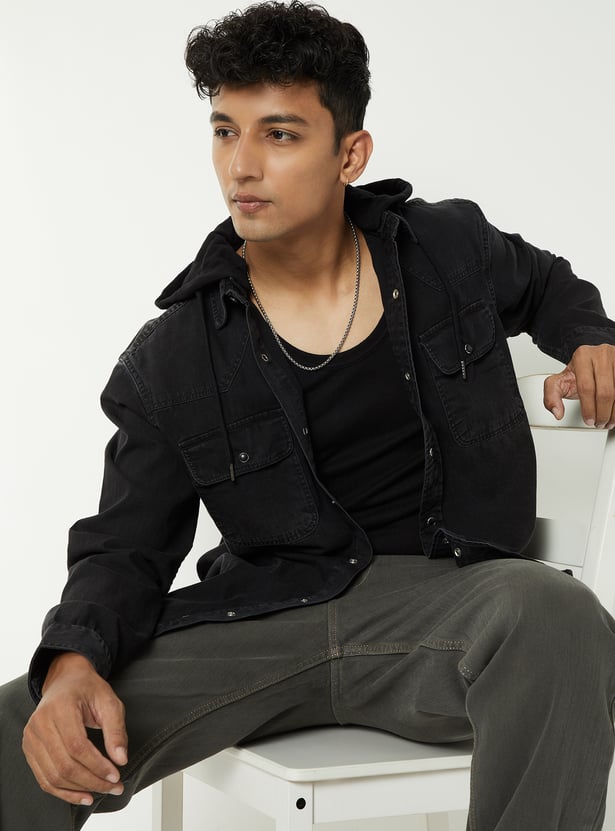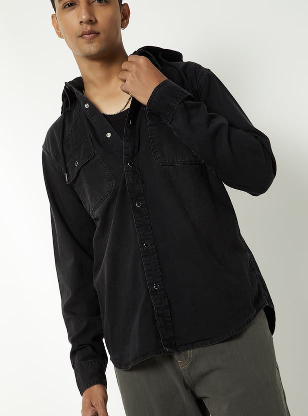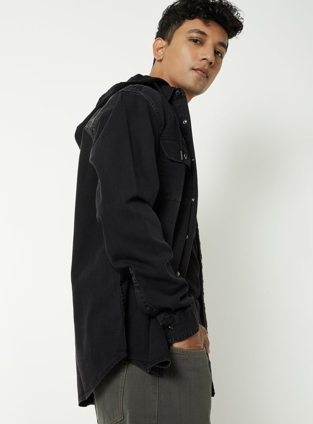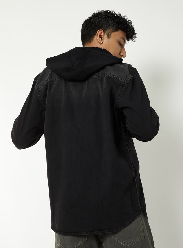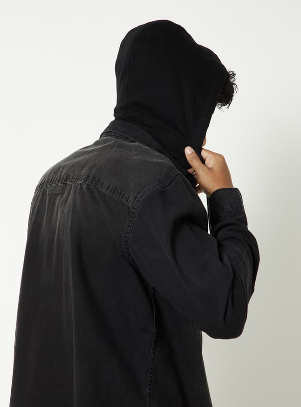 Add a rugged edge to your casual wardrobe with this washed denim shirt. Featuring a hooded design, flap pockets, full button closure, and long sleeves with button cuffs, it blends classic denim style with a modern twist.