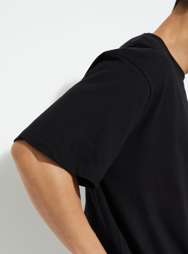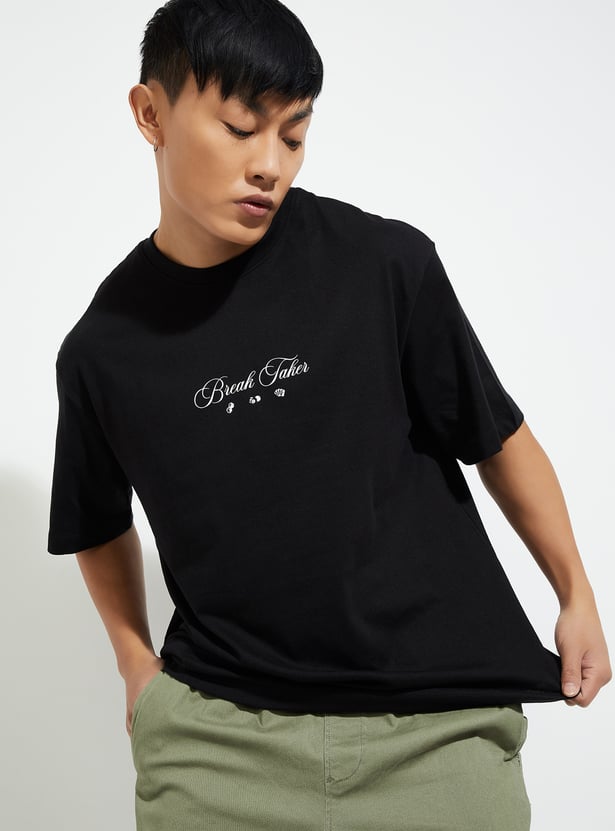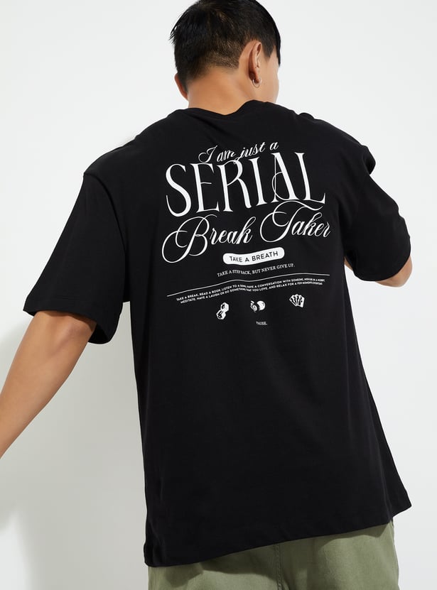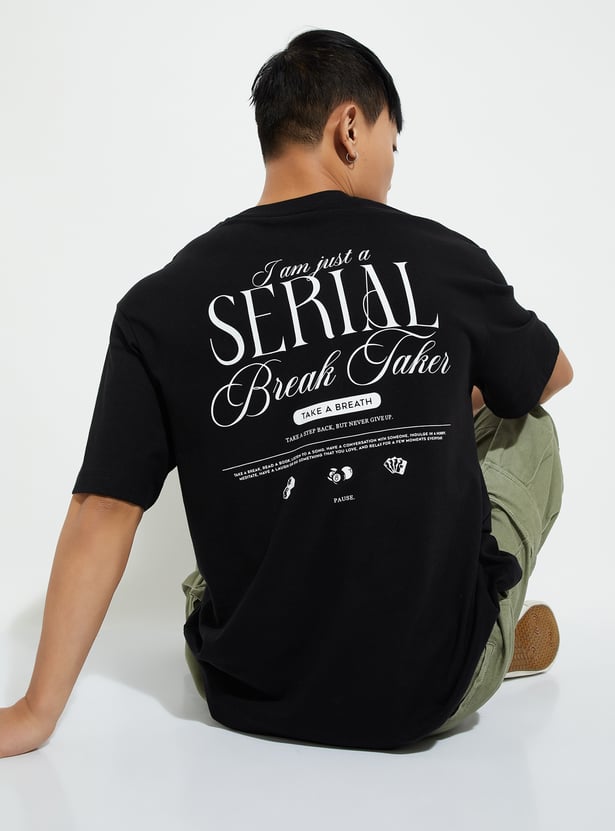 Level up your street style with this standout T-shirt. Showcasing a bold graphic print on the back and a stylish chest print, it features half sleeves and a classic crew neck that elevate your casual outfit with fresh, trendy flair.
