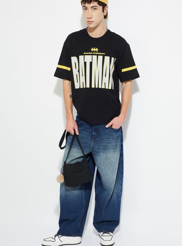 Show off your bold side with this oversized T-shirt featuring a striking Batman print. Designed with a classic crew neck and half sleeves, it delivers comfort with a statement look