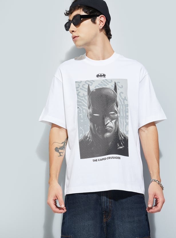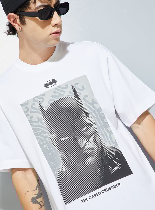 Show off your bold side with this oversized T-shirt featuring a striking Batman print. Designed with a classic crew neck and half sleeves, it delivers comfort with a statement look