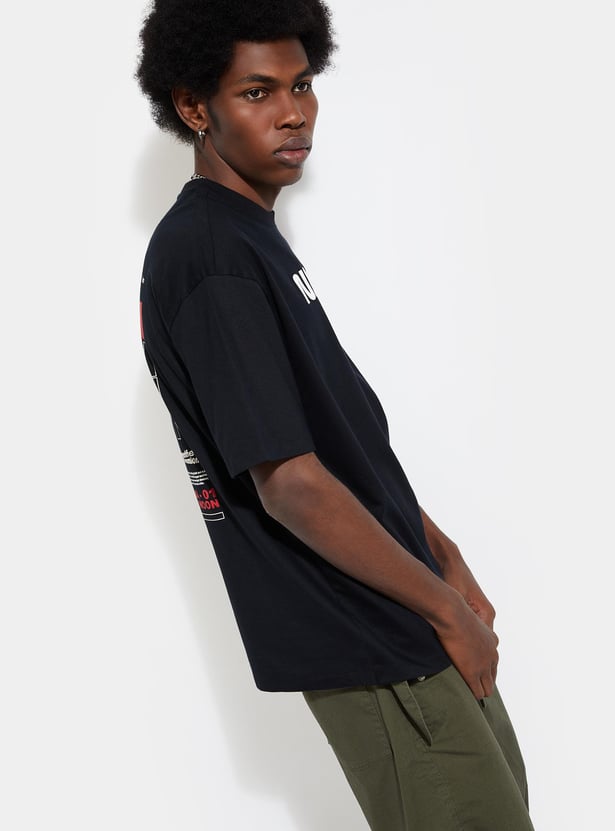 Upgrade your basic collection with this T-shirt. It has a crew neck, short sleeves, and an oversized profile. The graphic print at the front and back elevates the style.
