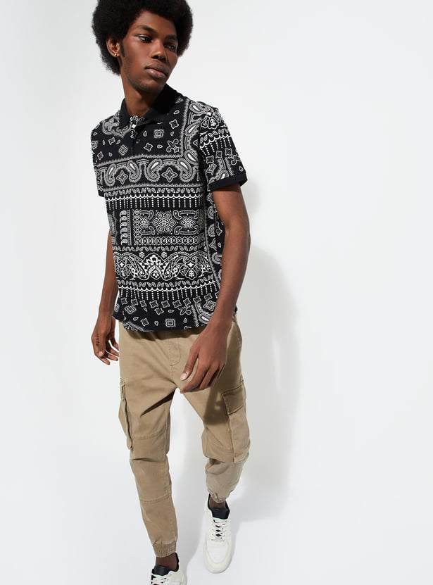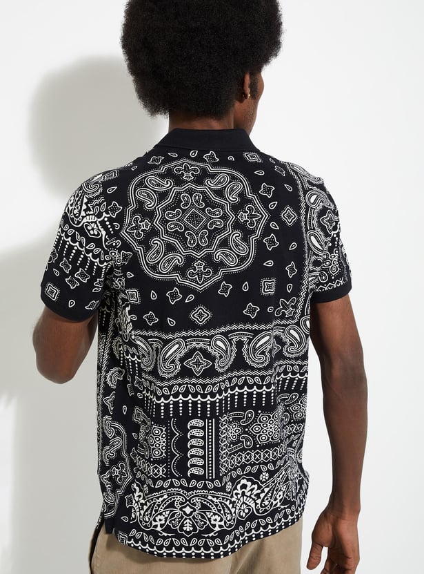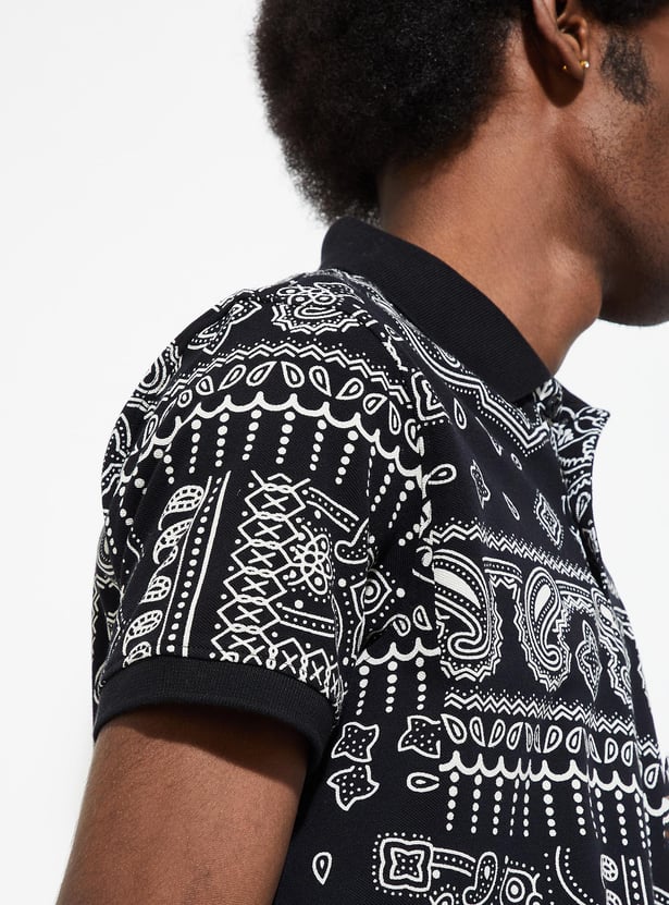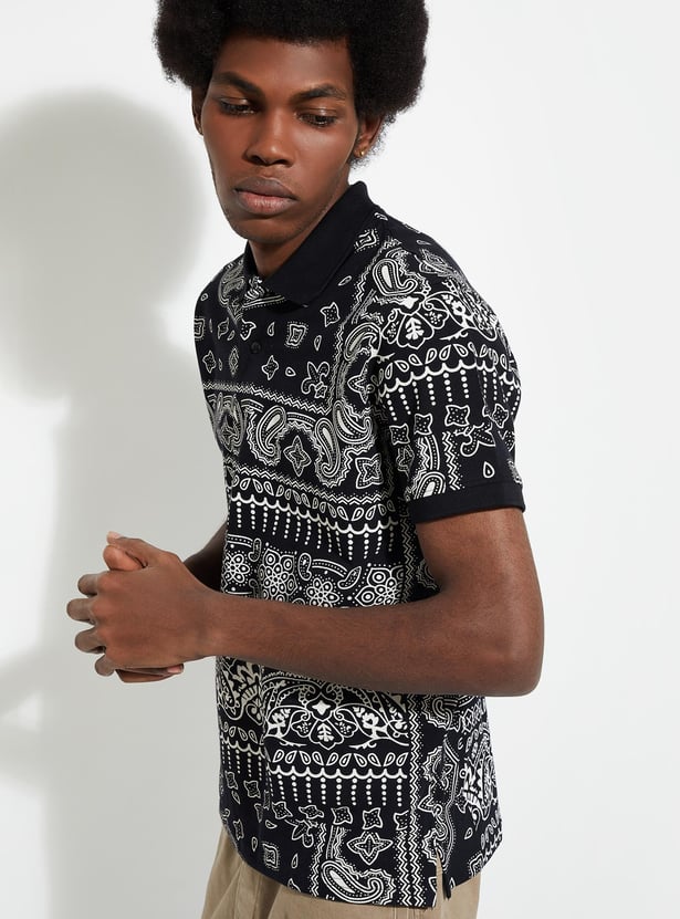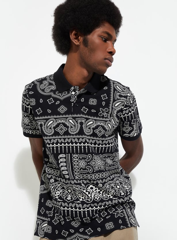 Revitalize your casual wardrobe with this polo T-shirt. Featuring a stylish bandana printed design, polo collar, half sleeves, and side slits at the hem, it's the perfect choice for upgrading your casual attire.