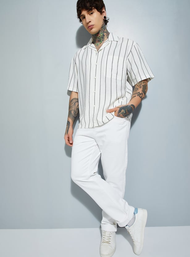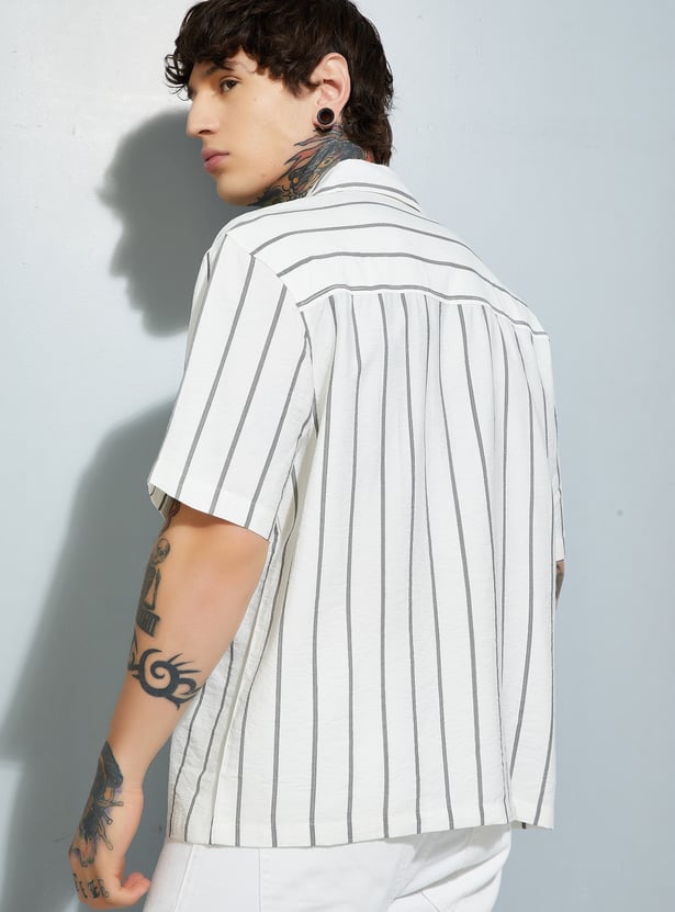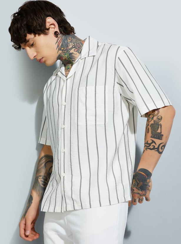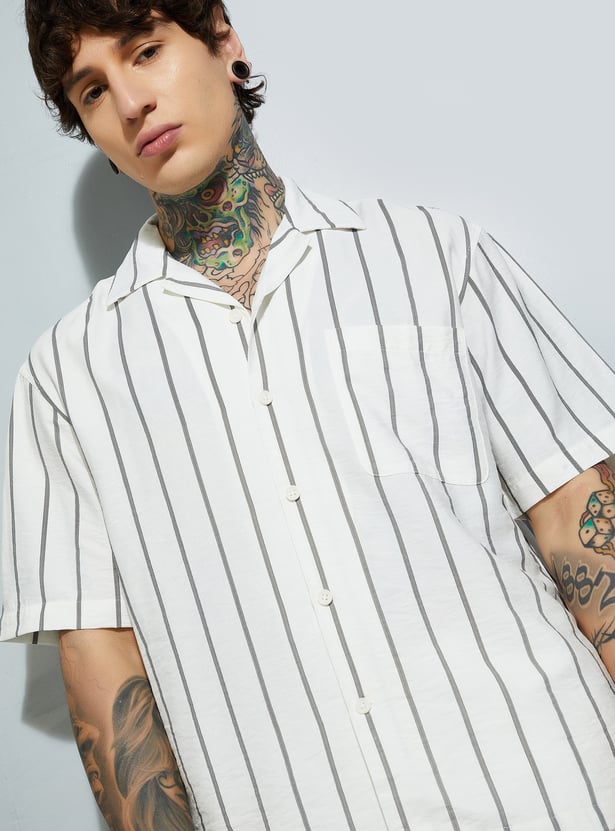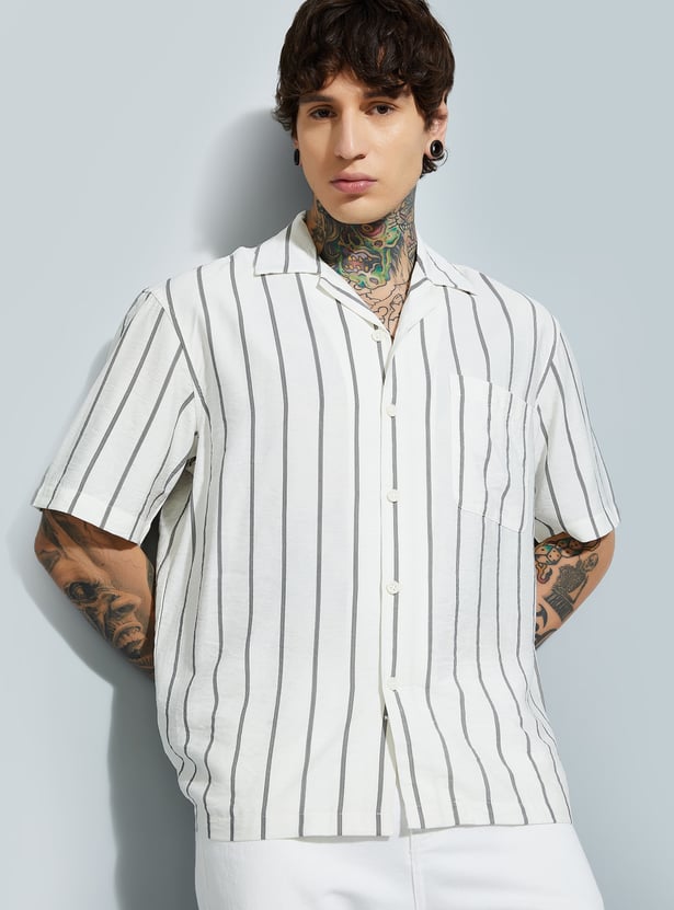 Add a vibrant touch to your wardrobe with this striped relaxed fit shirt. Designed with a relaxed resort collar, button placket, and half sleeves, it’s perfect for warm-weather days.