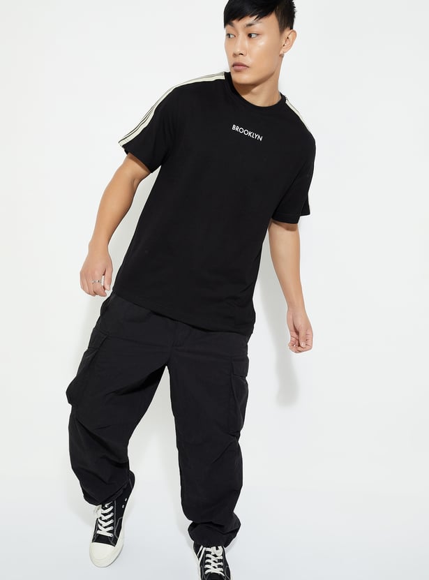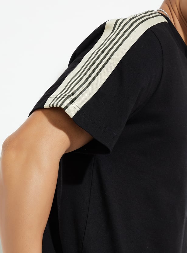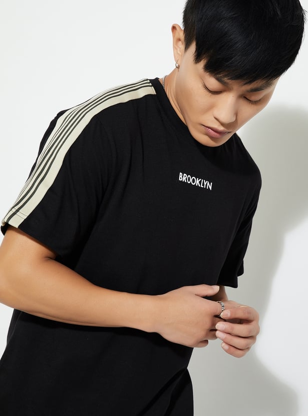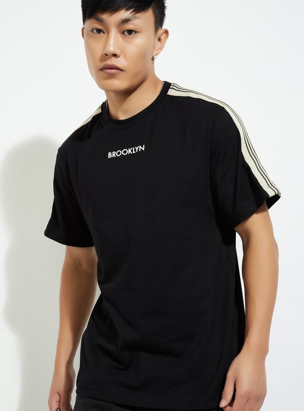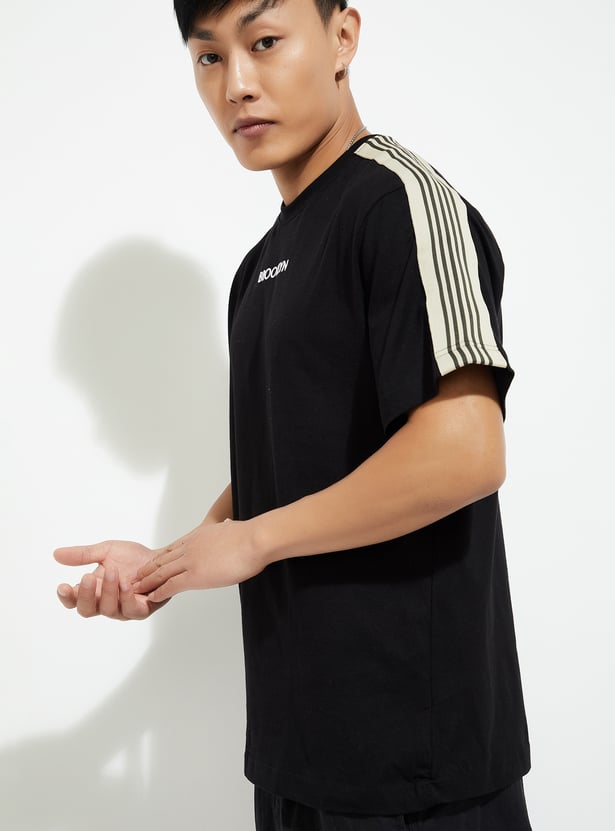 Elevate your casual game with this T-shirt. With a classic crew neck and chill half sleeves, it’s the ultimate laid-back piece. The striped detail from the shoulders gives it that trendy vibe, making it a perfect fit for any casual outing or hangout.