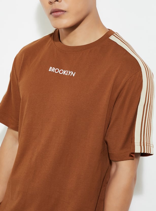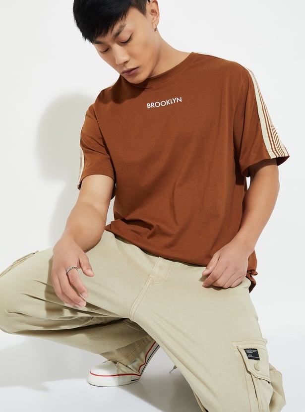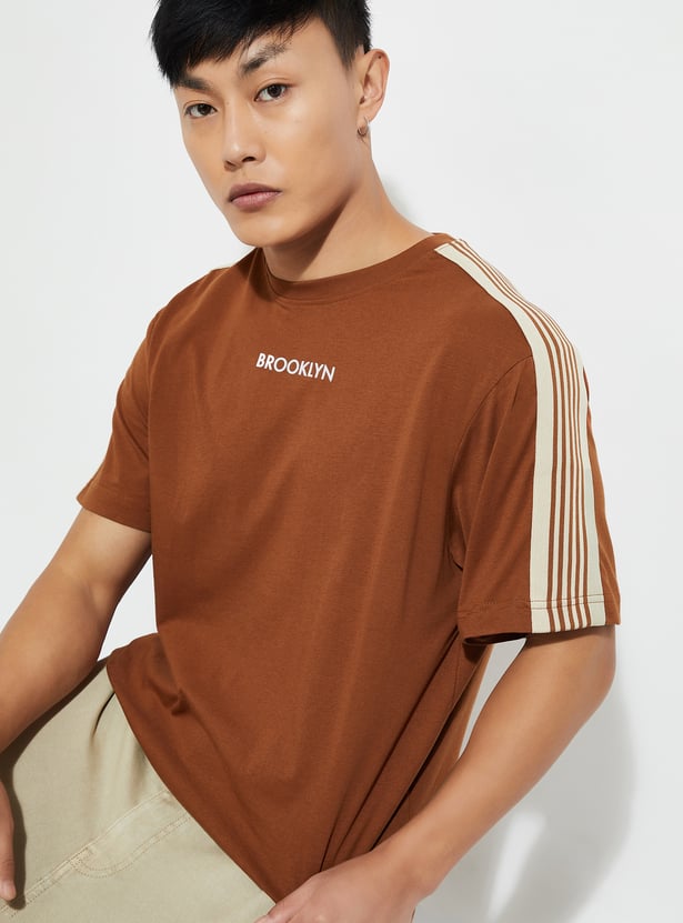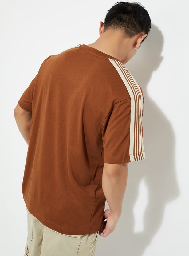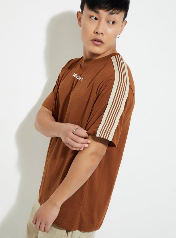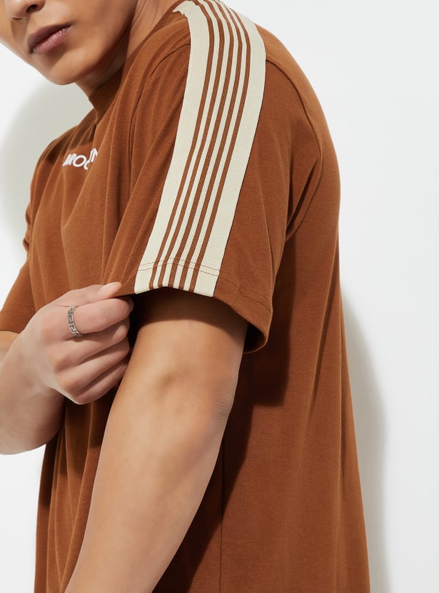 Elevate your casual game with this T-shirt. With a classic crew neck and chill half sleeves, it’s the ultimate laid-back piece. The striped detail from the shoulders gives it that trendy vibe, making it a perfect fit for any casual outing or hangout.