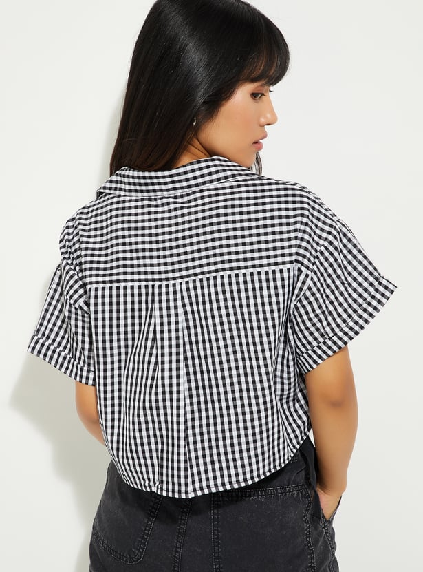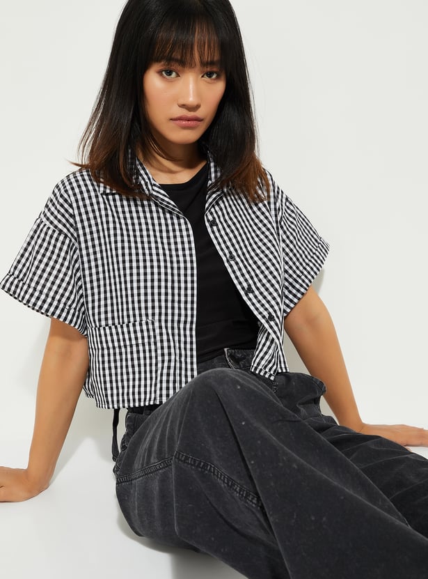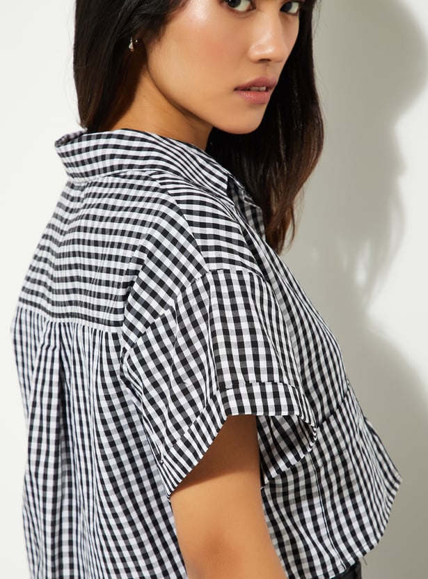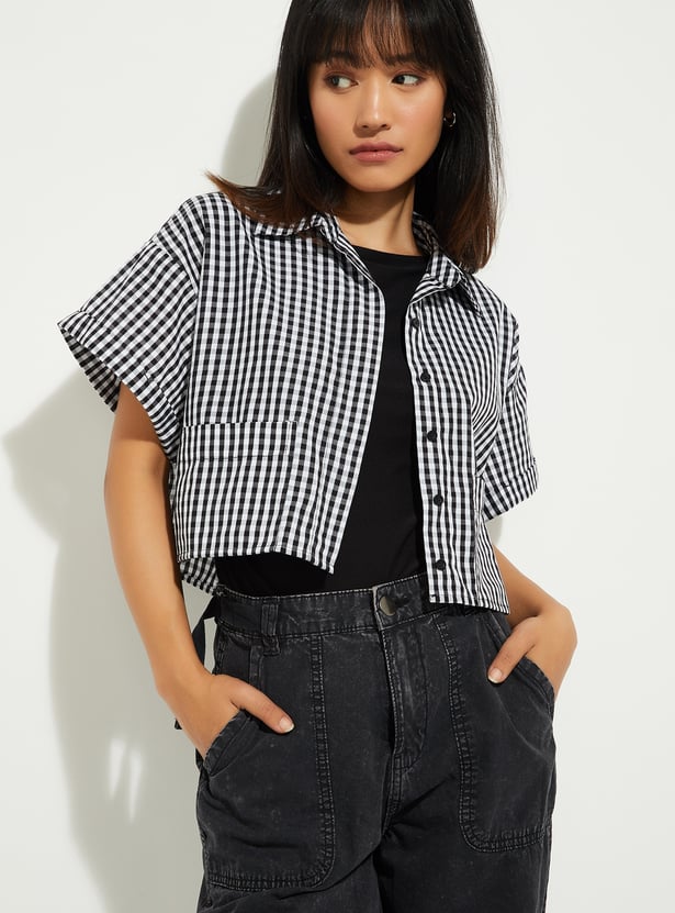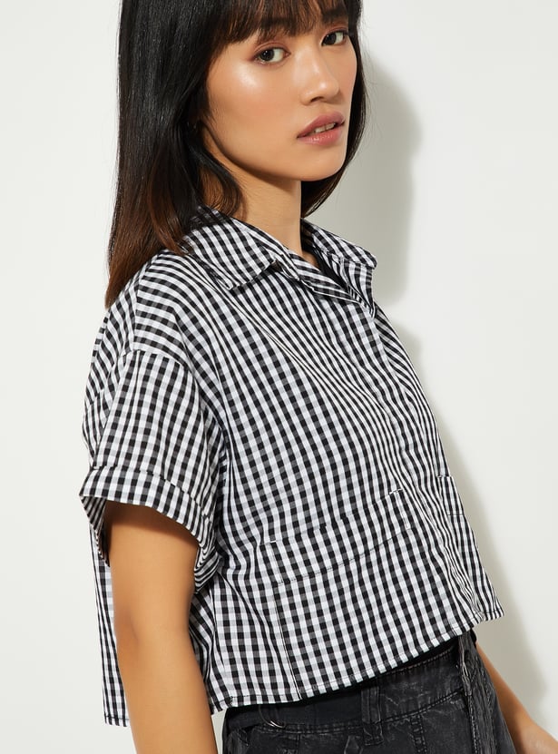 This checked crop shirt is all about that effortless, on-trend vibe. With a spread collar, half sleeves, 2 pockets, and a button-front design, it brings together classic style and modern flair.
