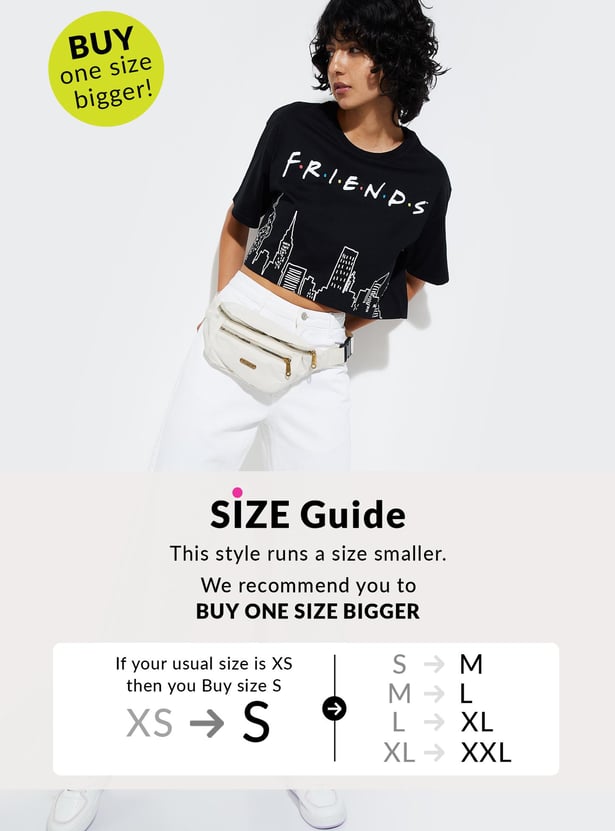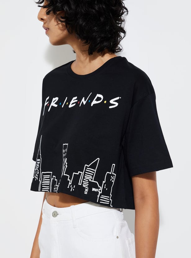 Achieve a chic weekend look effortlessly with this cropped-length tee. Featuring a round neck and half sleeves, its stylish appeal is elevated by the iconic Friends print adorning the front.