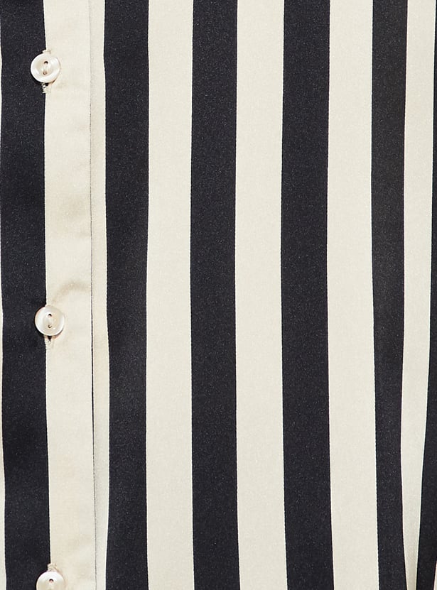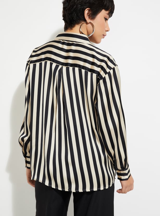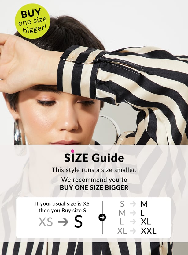 Elevate your wardrobe with this shirt. Crafted in an oversized profile, it is comfy and versatile. The luxurious satin fabric with bold stripes adds a touch of sophistication to any look. This shirt features a spread collar, full sleeves with buttoned cuffs, and a curved hem.