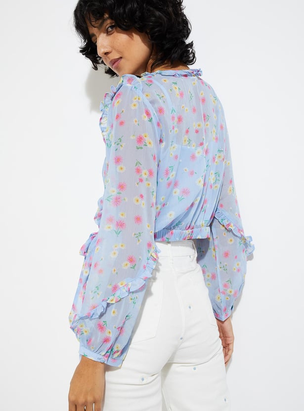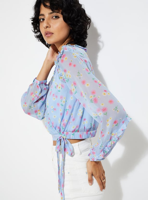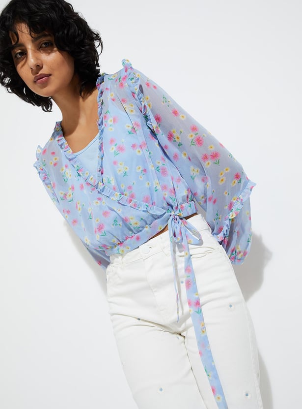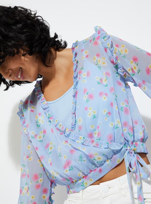 Add a stylish twist to your casual collection with this printed wrap top. Designed with a surplice neck, long sleeves, tie-up detail, and cropped profile, it offers a trendy and versatile look. Plus, it comes with a solid cropped camisole for added convenience.