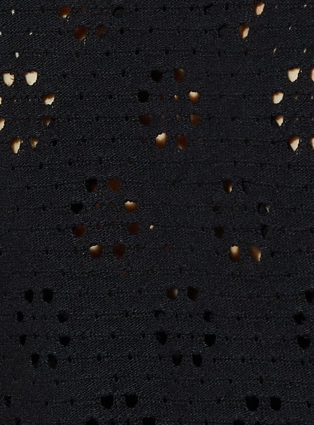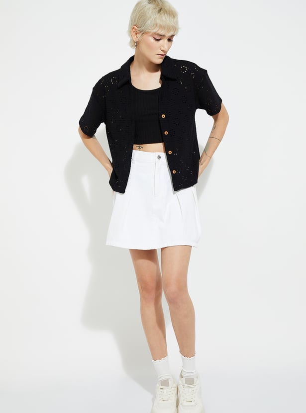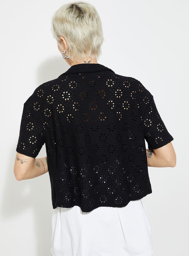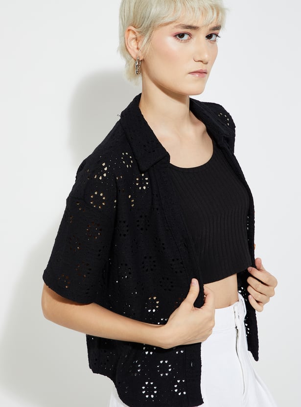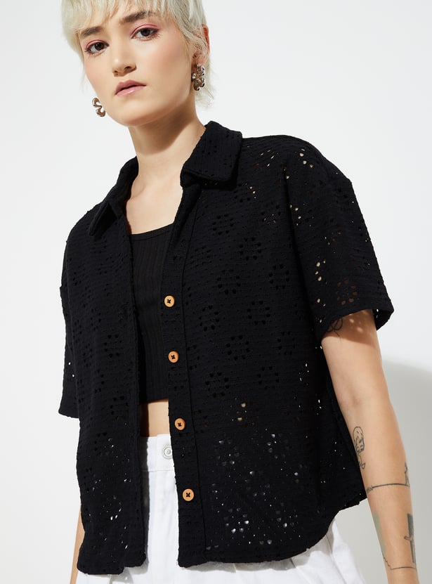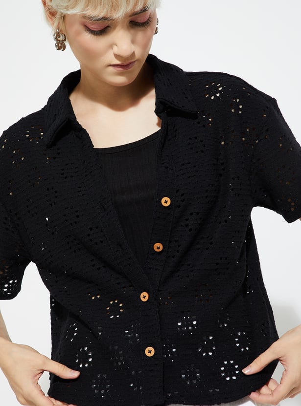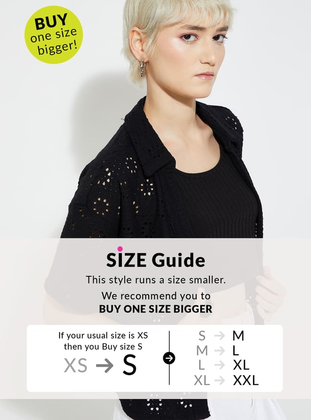 This Schiffli boxy fit shirt features a button placket, spread collar, and half sleeves. With its breezy silhouette and delicate embroidery, it’s perfect for warm, casual days.