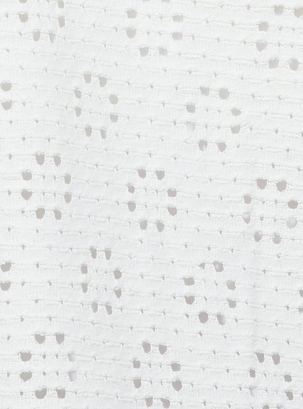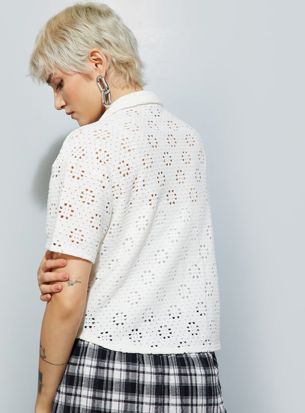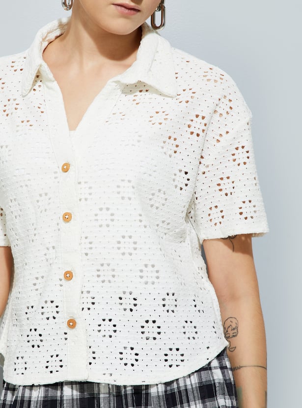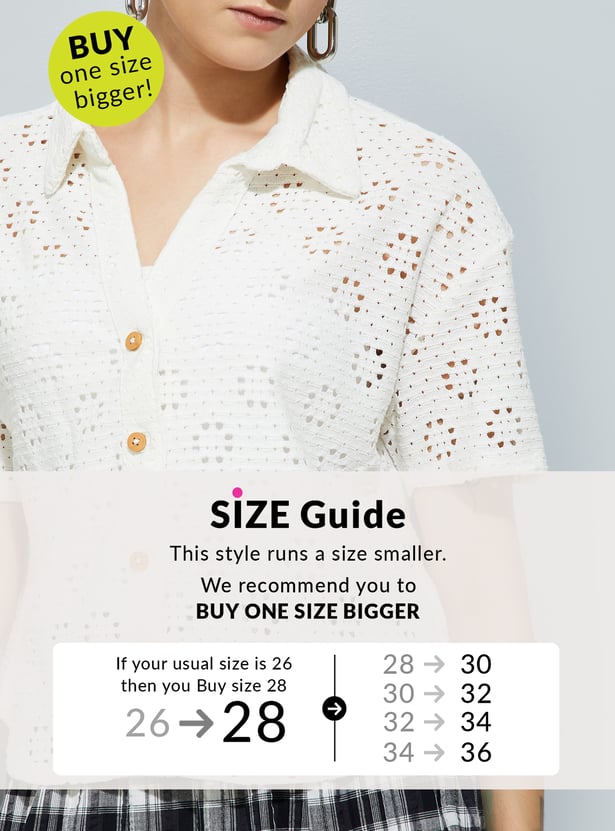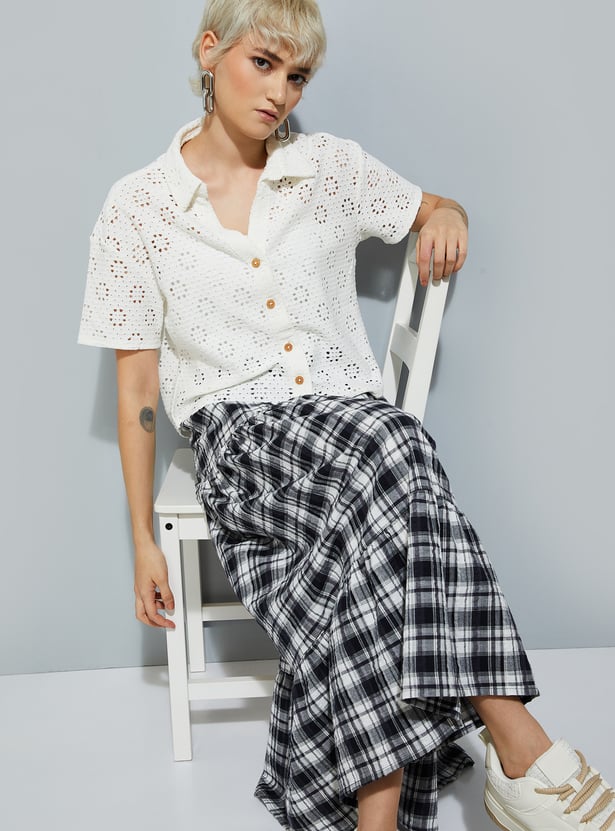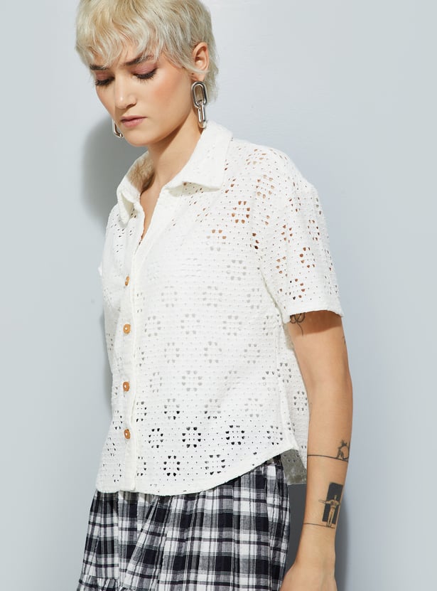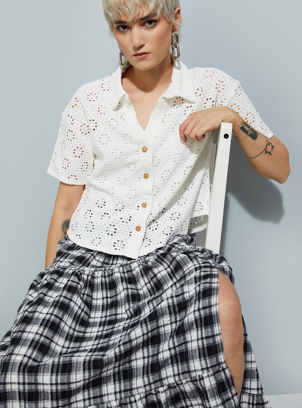 This Schiffli boxy fit shirt features a button placket, spread collar, and half sleeves. With its breezy silhouette and delicate embroidery, it’s perfect for warm, casual days.