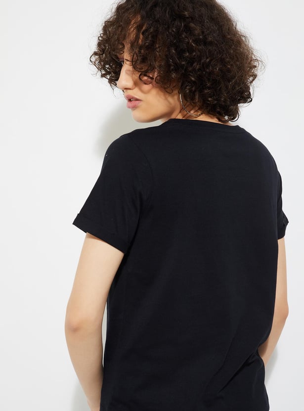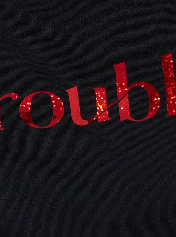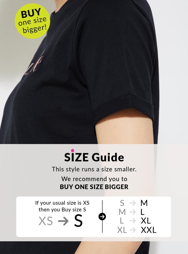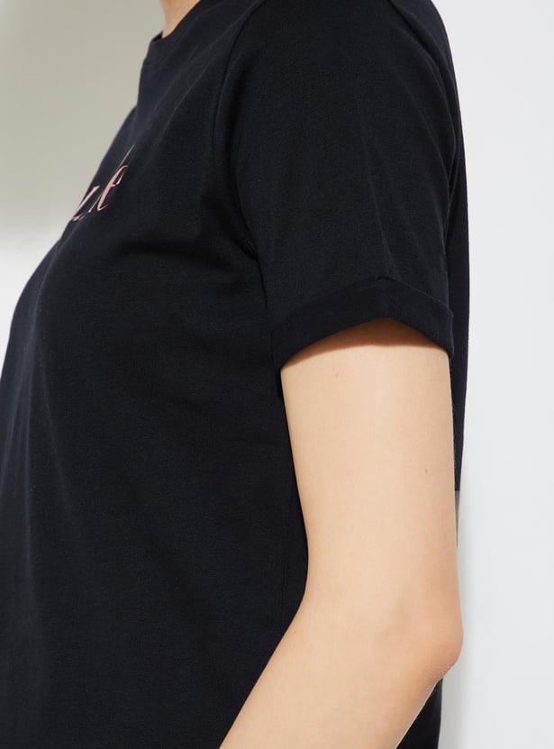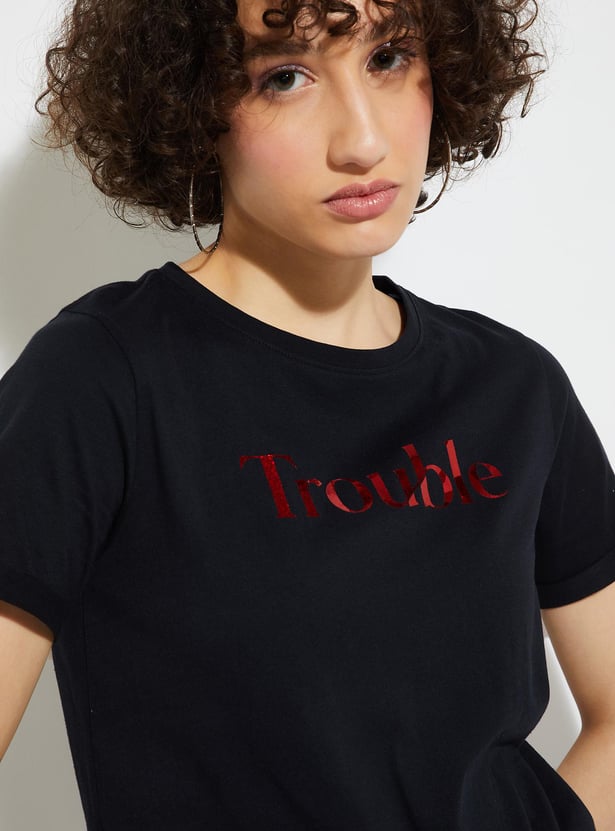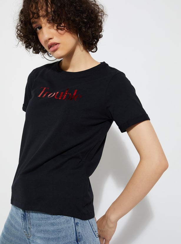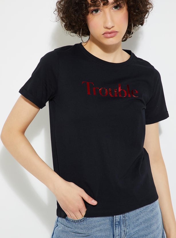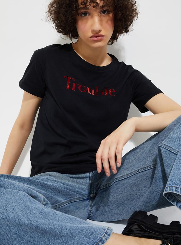 Upgrade your basic wardrobe with this T-shirt. It has a round neck and short sleeves. The shimmery typographic print glams up your everyday look.