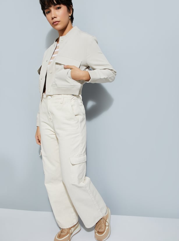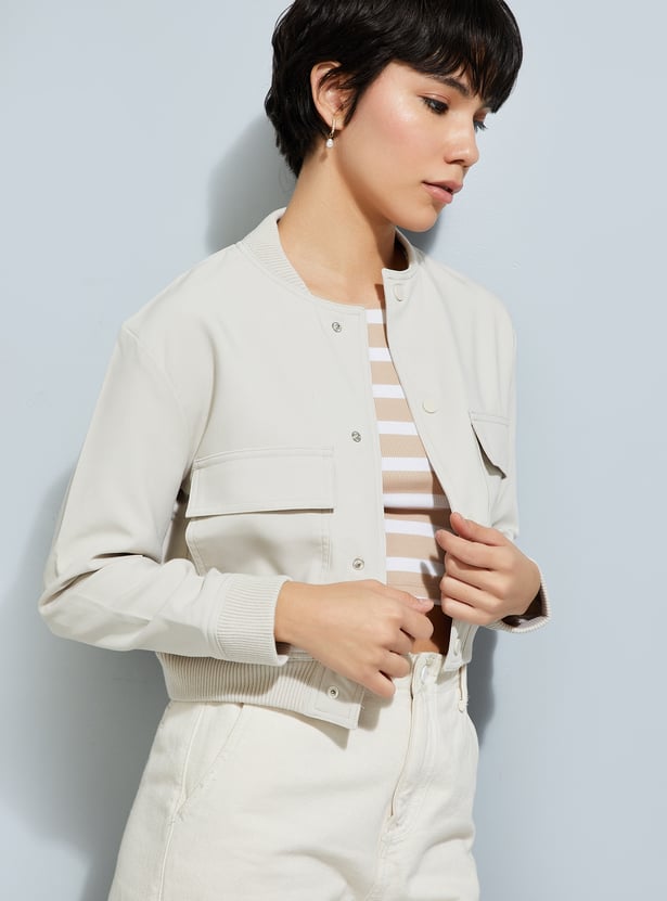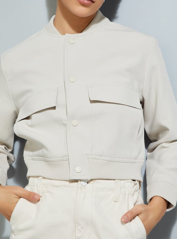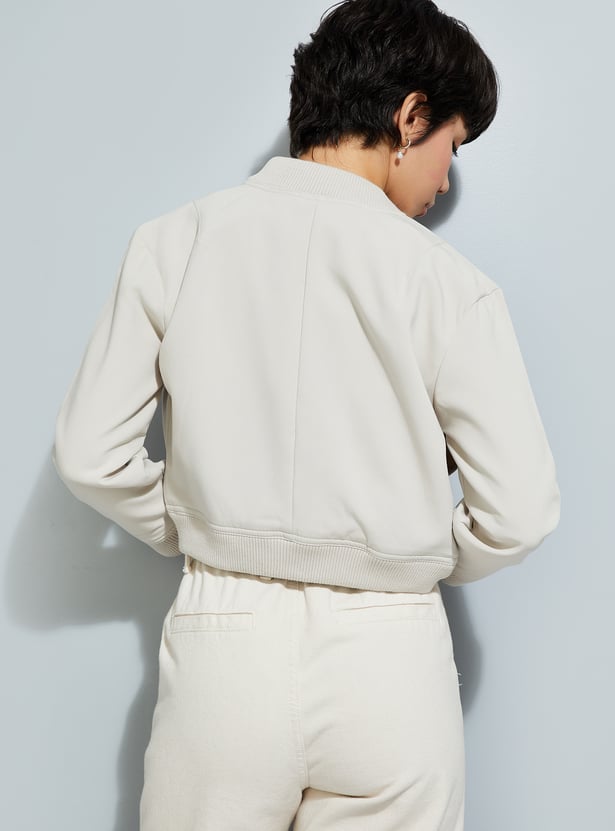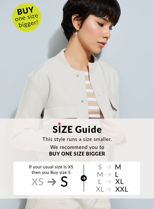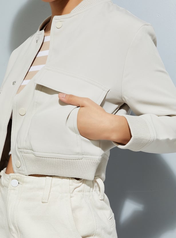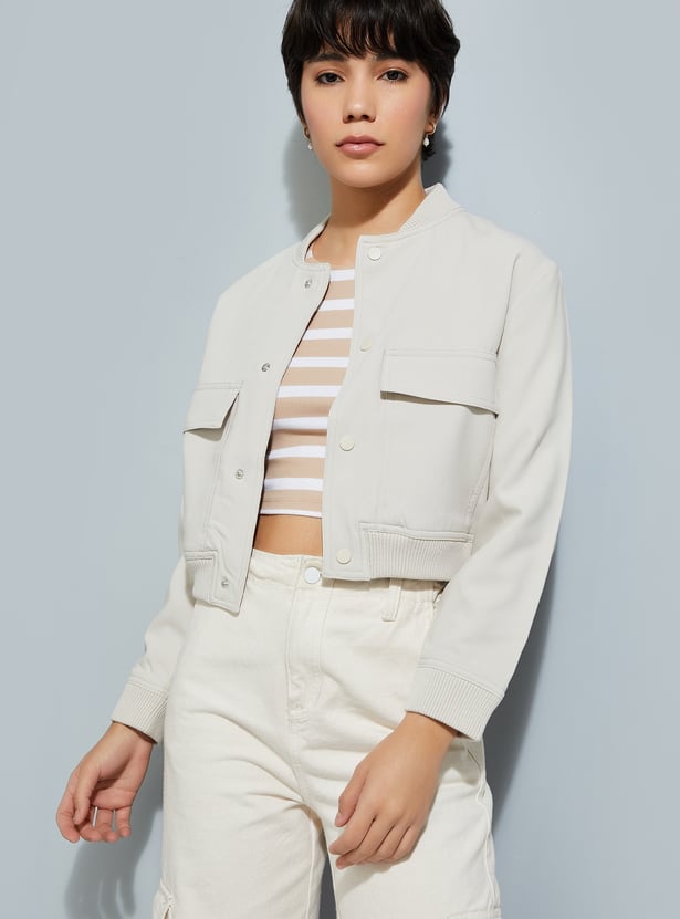 Level up your outerwear game with this bomber jacket. The baseball collar, full sleeves, and ribbed trim give a sporty look. The double-flap pockets add to the functionality.