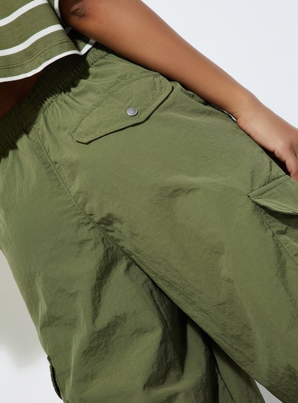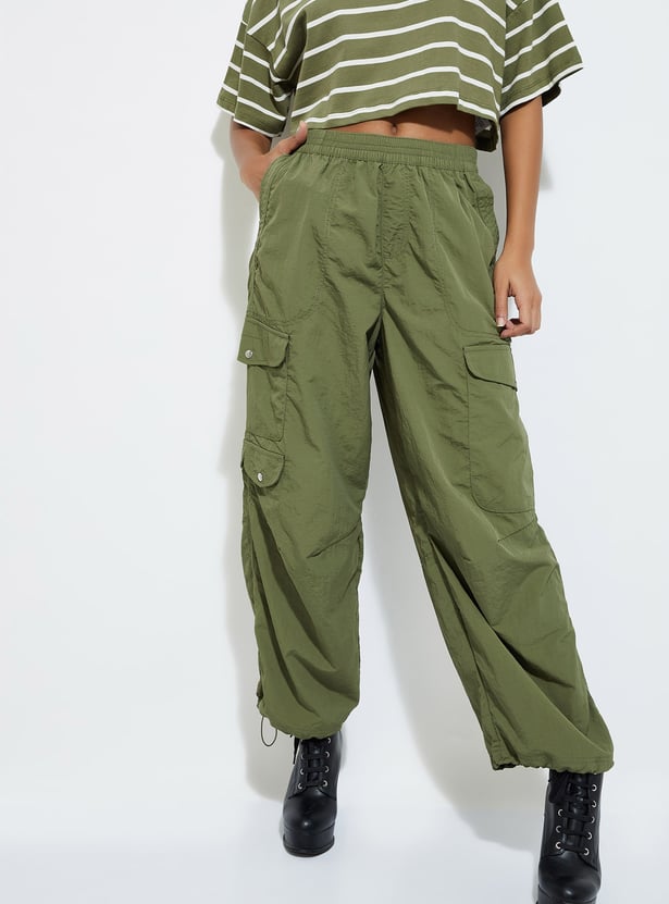 Make a chic statement in these parachute pants, rendered in a solid tone. Featuring a drawstring waist, cargo pockets, and a drawcord hem, they blend functionality with street-smart style. Perfect for elevating your casual game.