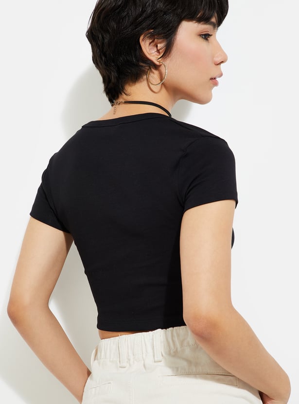 Your go-to piece for an instant street-style upgrade, this T-shirt is crafted in a crop profile. It has a round neck and half sleeves.