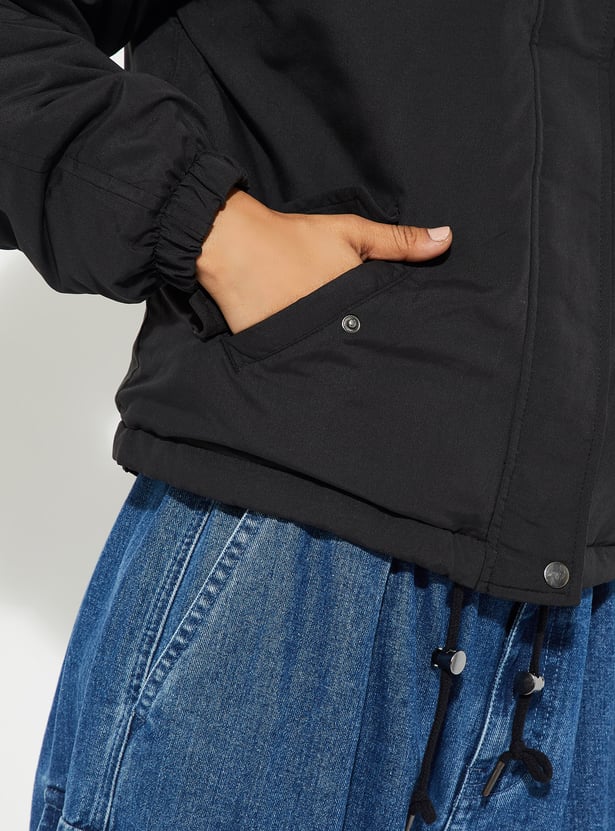 Stay warm and stylish with this solid hooded jacket, featuring full sleeves, a zip closure, and functional pockets. Designed for comfort and versatility, it’s perfect for layering during cooler days.