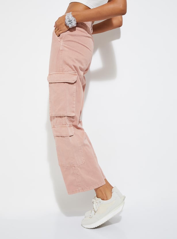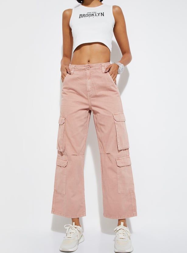 Revamp your wardrobe with these solid cargo trousers for women. They're a perfect blend of utility and sophistication, boasting multiple pockets, belt loops, and a button-zip closure. With ample pocket space and a versatile design, they're both practical and stylish for everyday wear.
