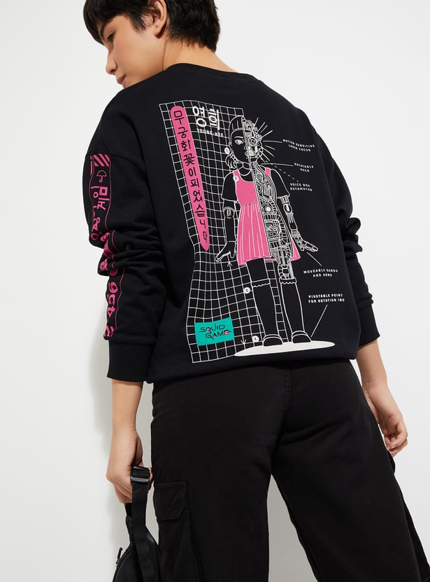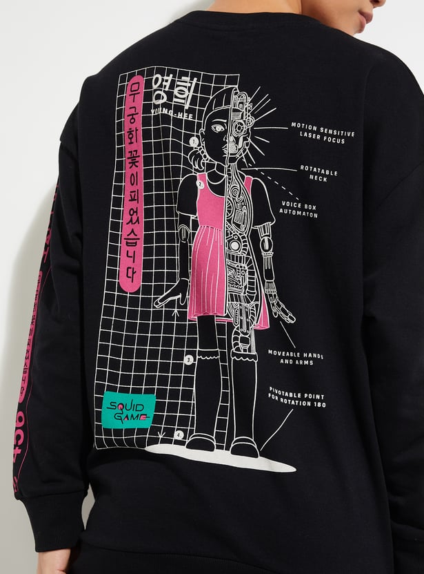 Join the game of style with this sweatshirt. It features iconic graphics inspired by the hit series, making it a standout addition to your casual wardrobe. This sweatshirt features a round neck, full sleeves, and ribbed trim.