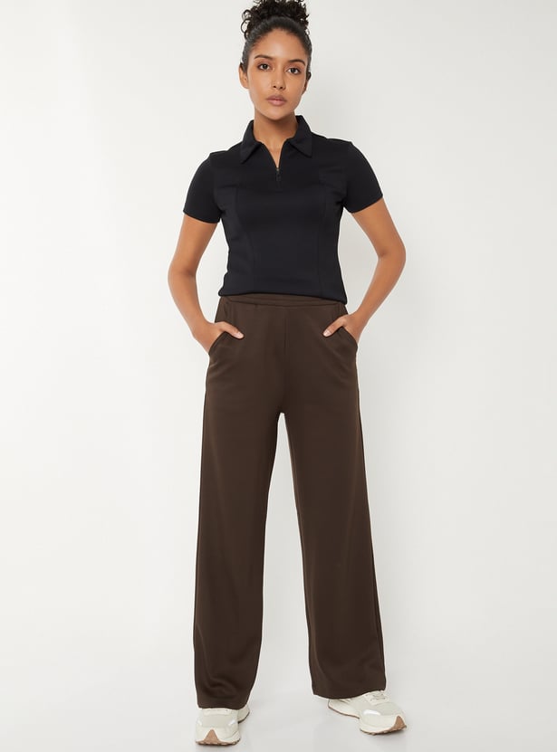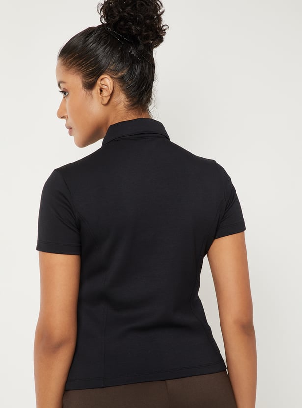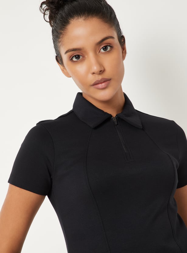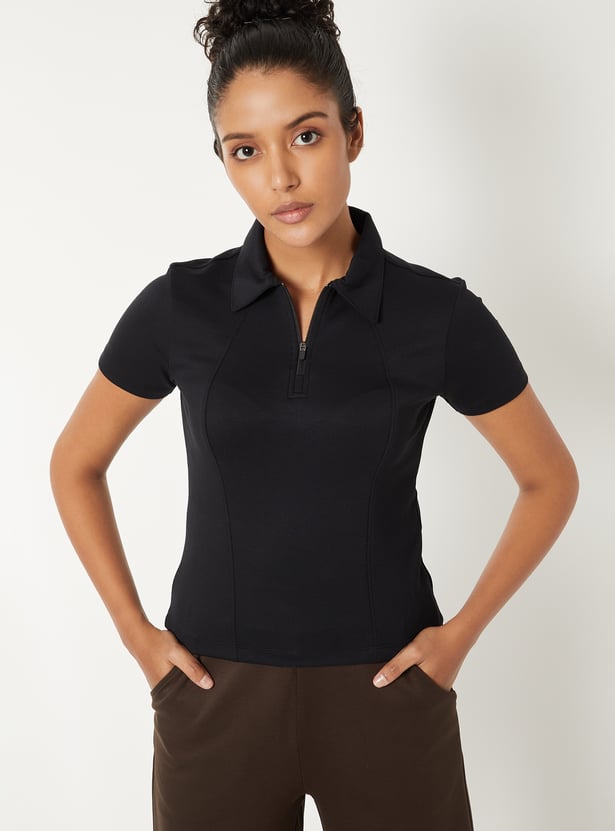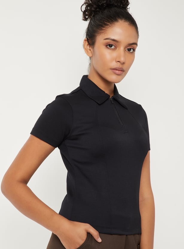 Elevate your sporty style in this t-shirt that has a solid design, a polo collar, half sleeves, and a zipper closure accentuate your persona. Designed in a slim silhouette, this polo t-shirt is versatile, making it an ideal addition to any outfit for all sporty occasions.