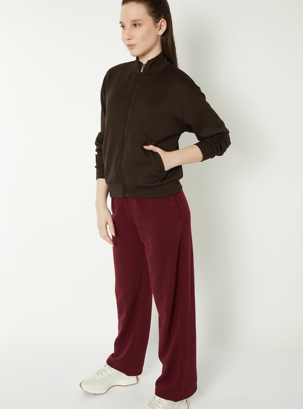 Stay effortlessly sporty with this boxy-fit sports jacket, featuring a sleek mock collar and full sleeves. Practical side pockets add functionality, while the solid tone keeps the look clean and versatile.