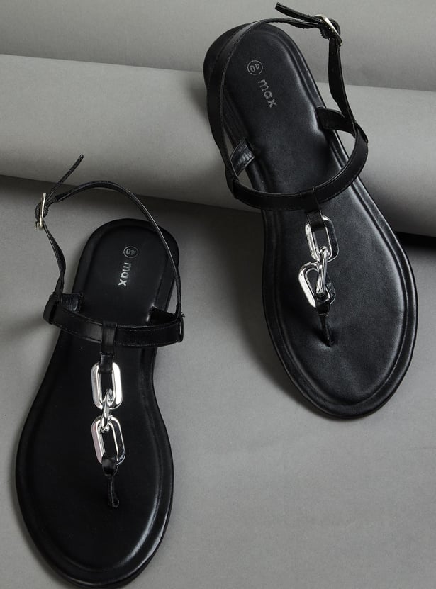 Elevate your ensemble with this pair of flat sandals. It has an open toe, a T-strap with chain accents, buckle closure at the back and a durable outsole.
