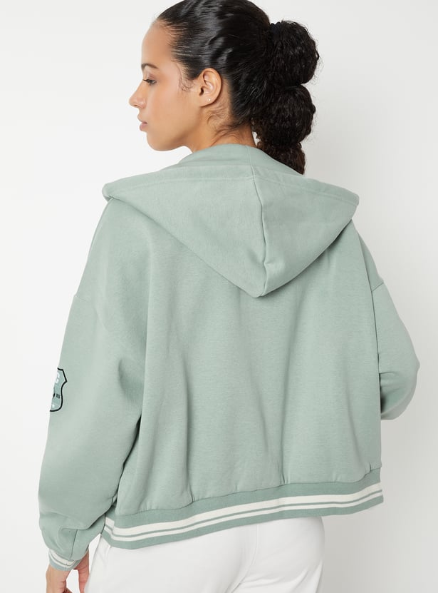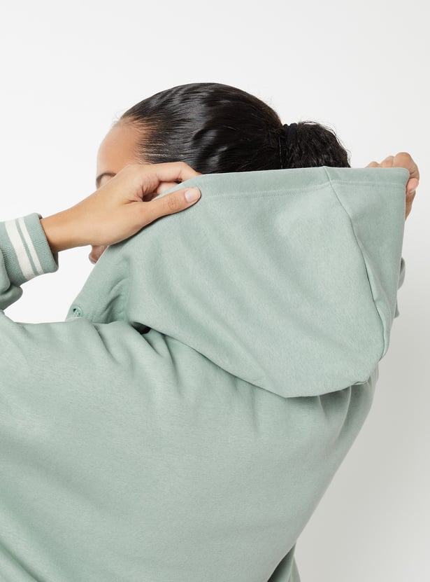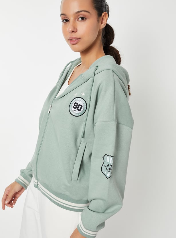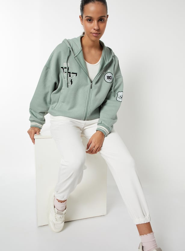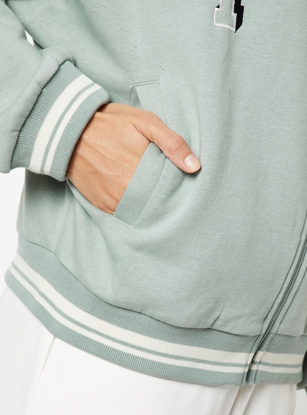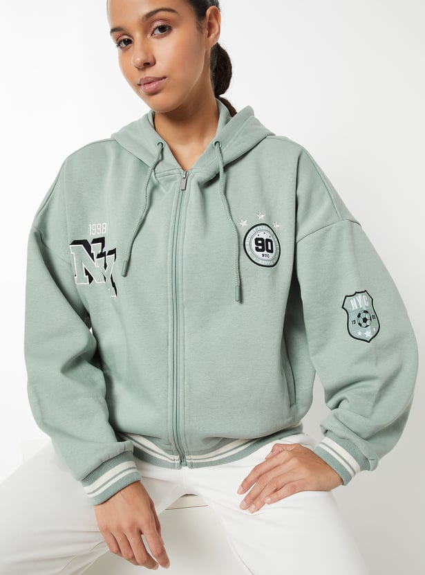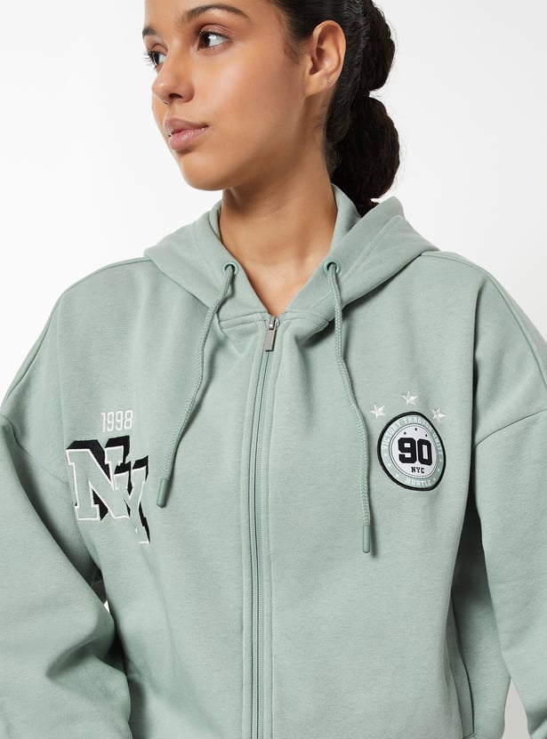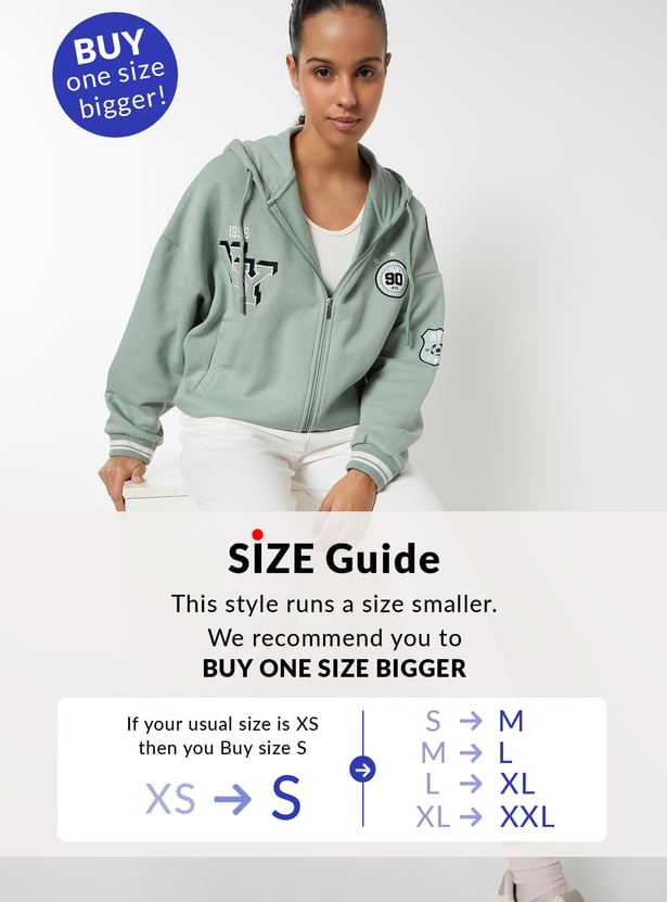 Stay warm and stylish in this chenille embroidered boxy fit jacket, featuring a cosy hooded neck, zip closure, full sleeves, and functional side pockets. Model Size :