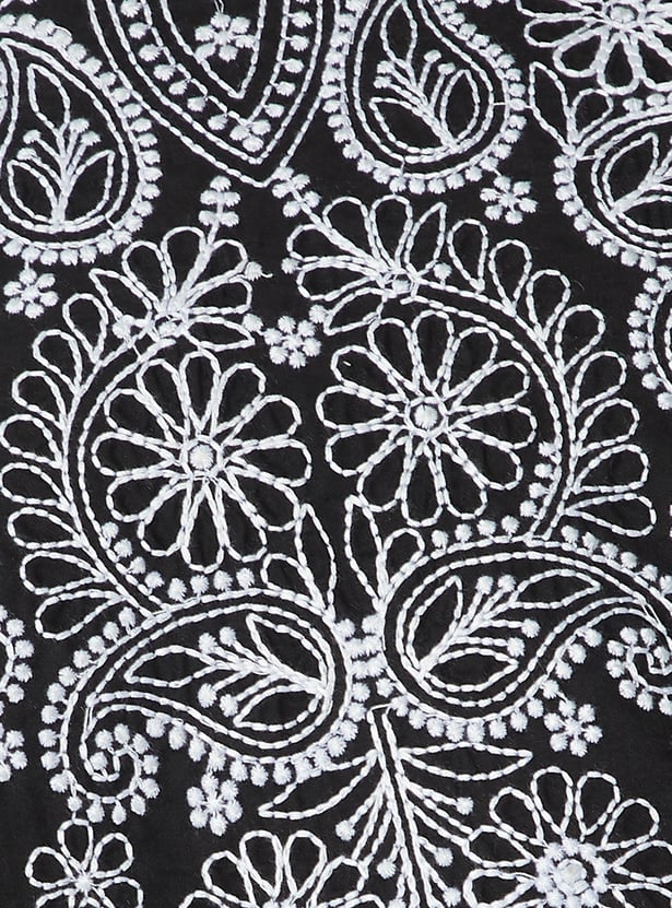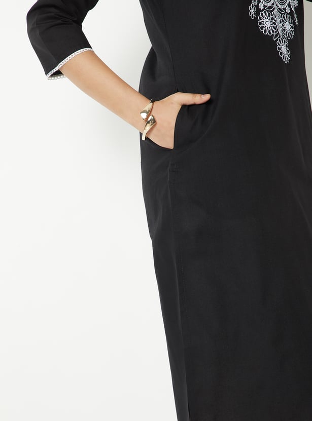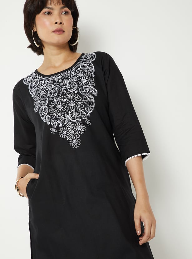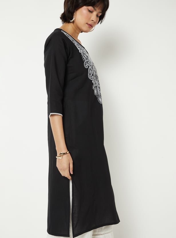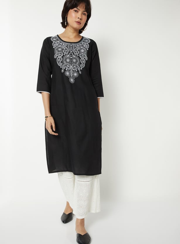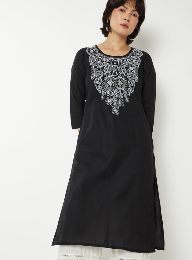 This Chikankari embroidered kurta features intricate hand-embroidered detailing on the front yoke, combined with a round neck and 3/4 sleeves. Designed in a straight fit with side pockets, it offers a perfect blend of elegance and everyday comfort.