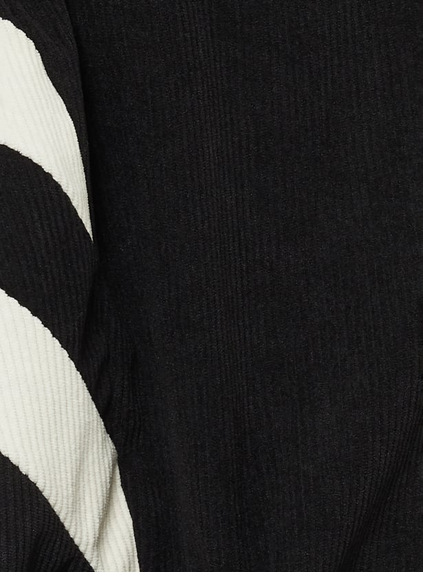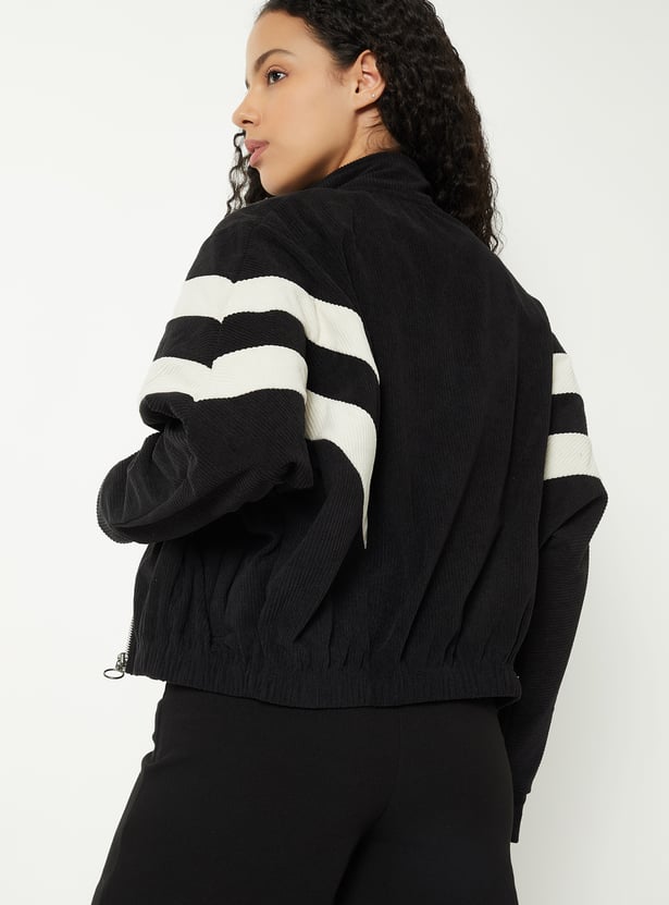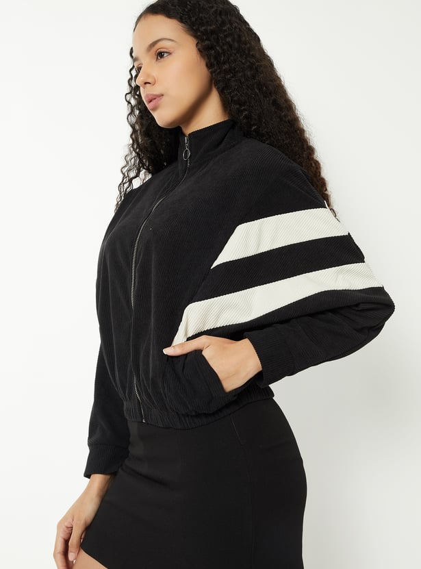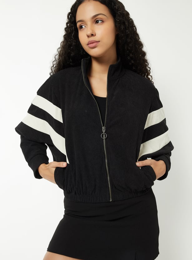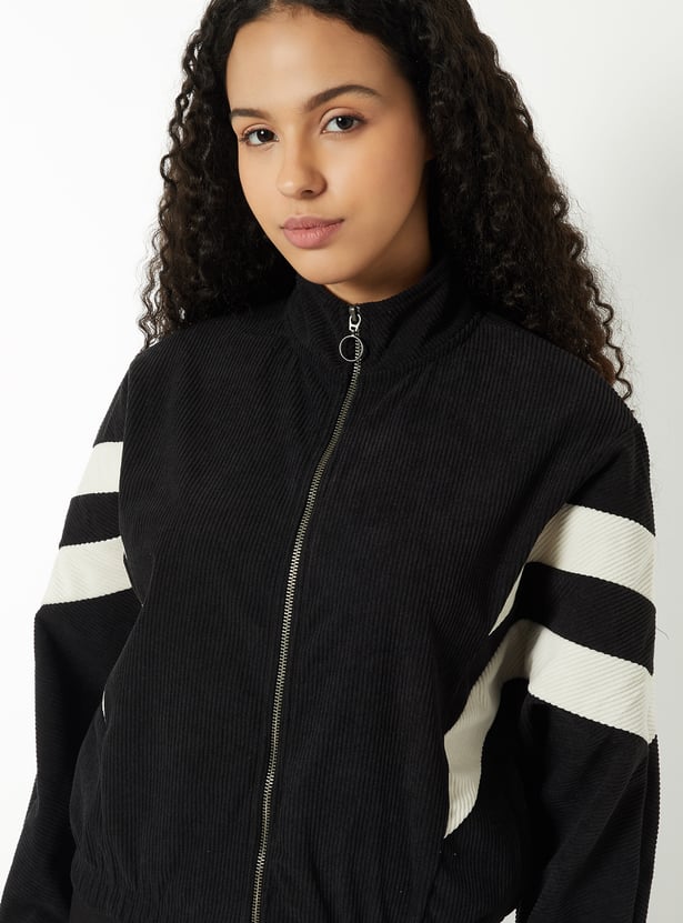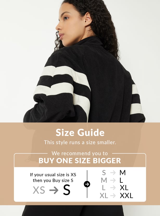 Step out in casual sporty style with this corduroy jacket, featuring a mock neck and a boxy fit for effortless comfort. Stripes on the sleeves add a playful, sporty touch, while the zip-front closure and full sleeves provide practicality. Side pockets and elasticated hem offer everyday functionality.