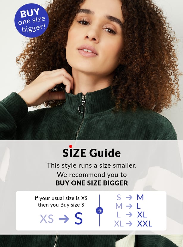 Upgrade your casual wardrobe with this corduroy sporty jacket. Featuring a chic mock collar, full sleeves, and a bold colour-blocked design, it adds a stylish edge to any outfit. Complete with a zip front, functional pockets, and an elasticated hem for a snug fit, this jacket blends fashion and functionality effortlessly.