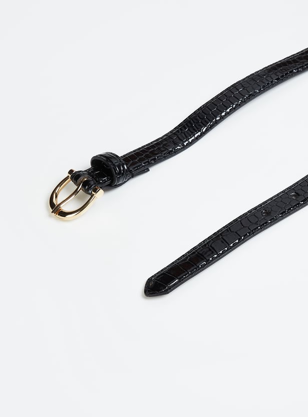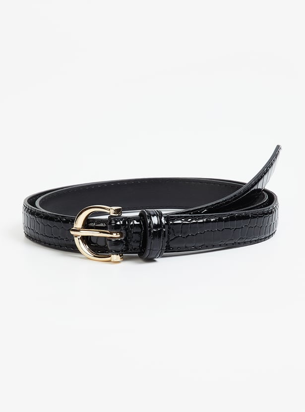 A versatile accessory that complements any ensemble, this belt is a must-have. Its textured, croc-inspired design adds an edgy flair. It has a prong buckle closure for a secure fit.