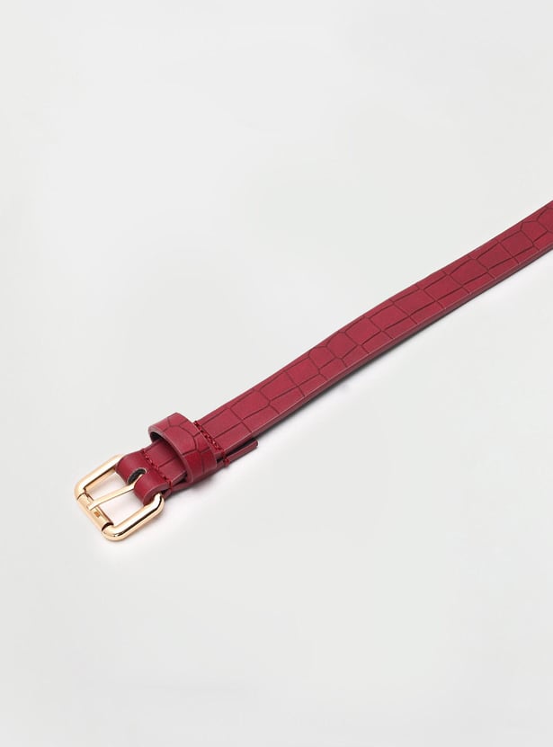 This croc-embossed belt, which features an easy buckle closure, can add style to any ensemble. Team it up with trousers and a tucked-in shirt for that endorsed look.