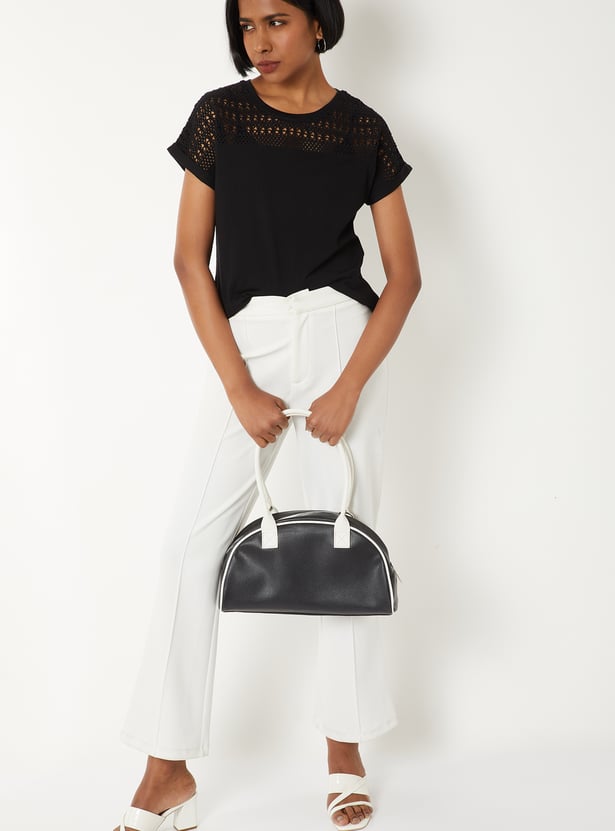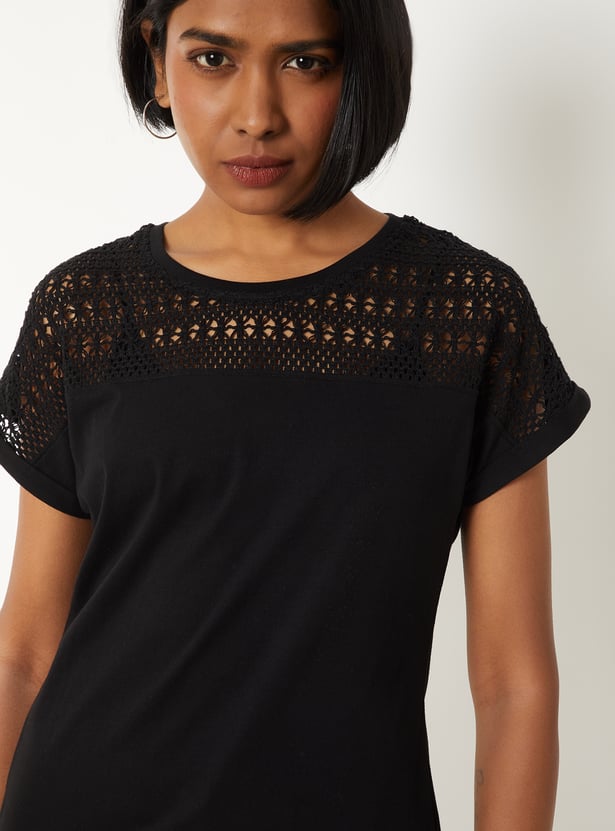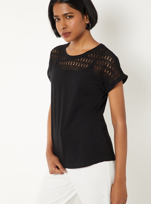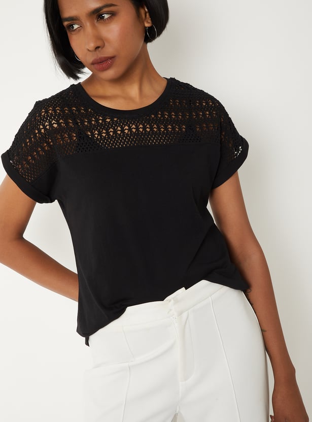 Refresh your everyday wardrobe with this crochet knit top, designed for both comfort and versatility. Featuring a classic round neck and half sleeves, it offers a clean, minimal look that’s easy to style for any occasion.