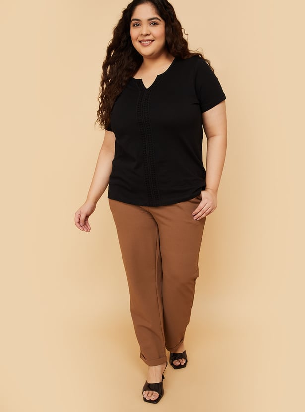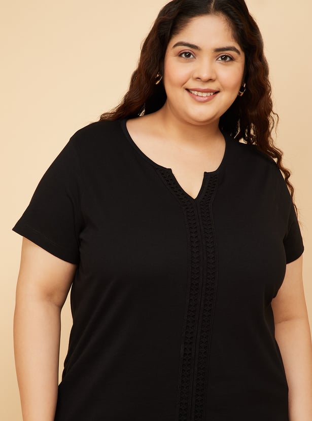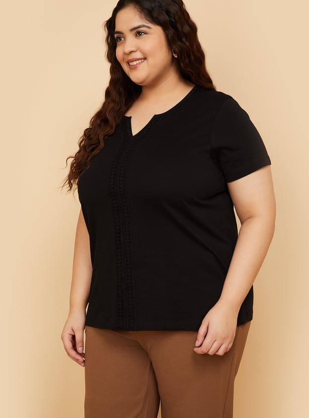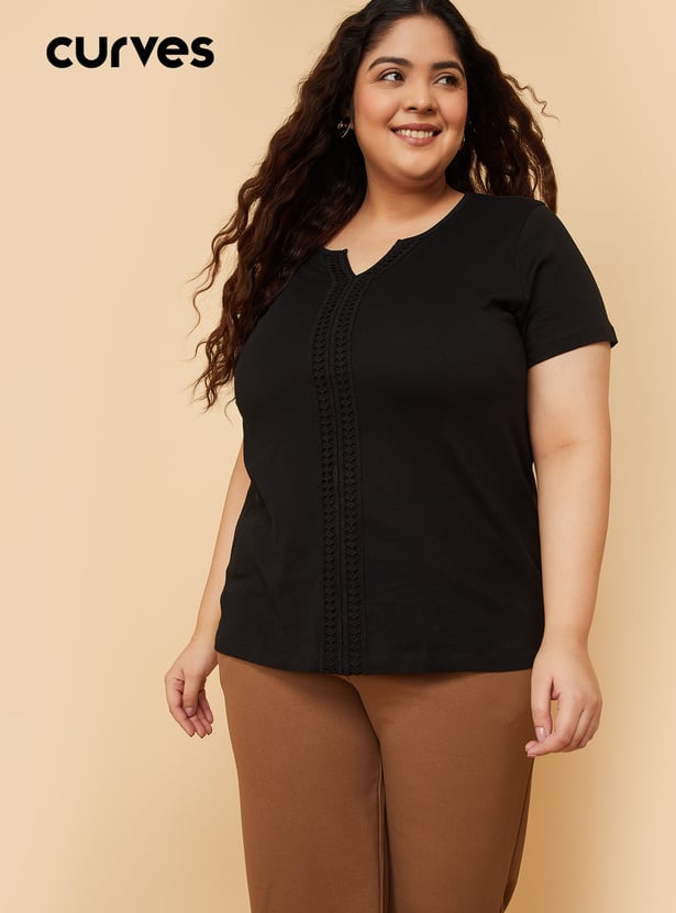 This crochet panel top features a Henley neckline and half sleeves, with delicate crochet detailing that adds a touch of elegance to casual wear. Perfect for layering or wearing on its own for a chic, effortless look. Model Size :