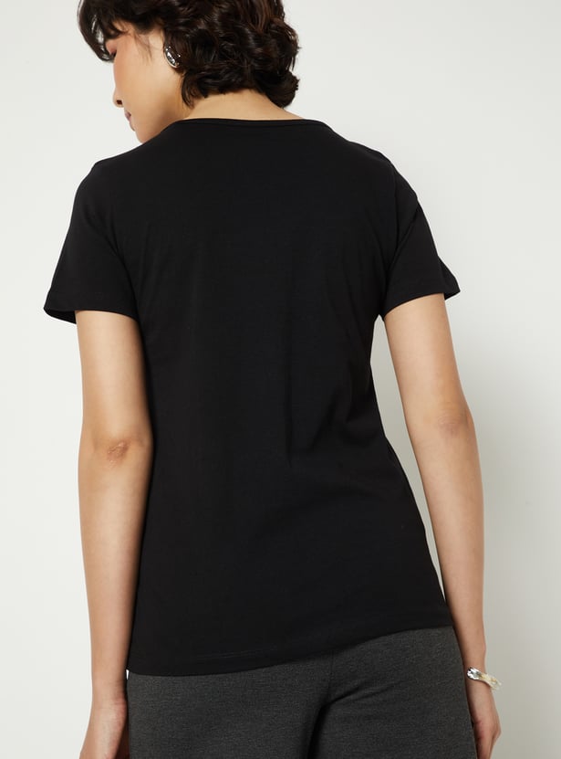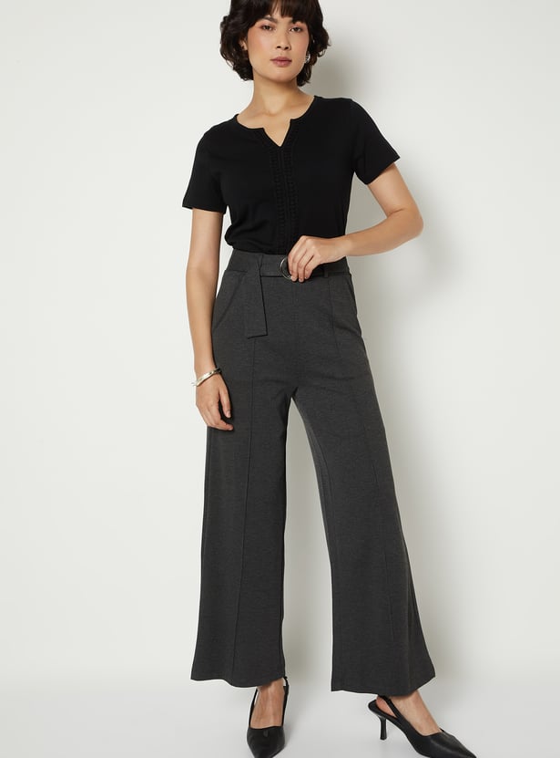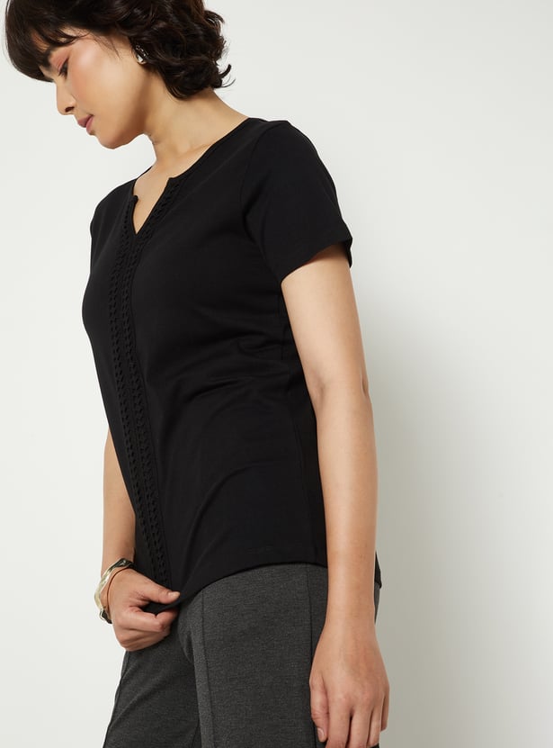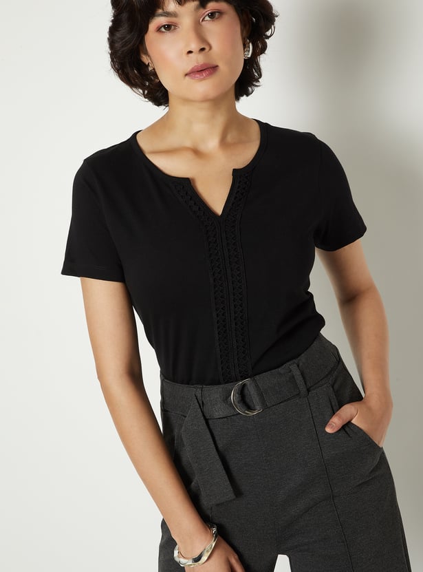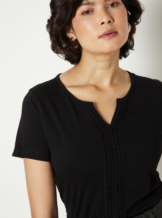 This crochet panel top features a Henley neckline and half sleeves, with delicate crochet detailing that adds a touch of elegance to casual wear. Perfect for layering or wearing on its own for a chic, effortless look. Model Size :