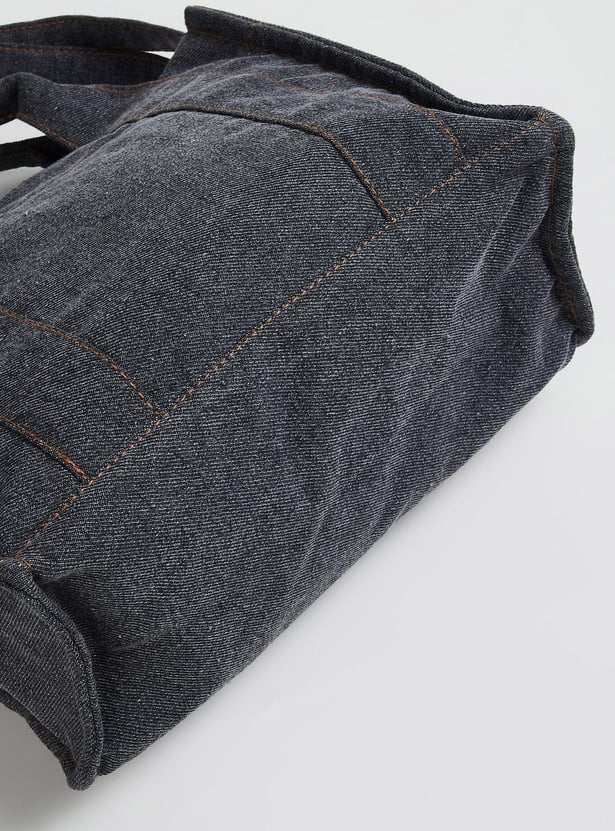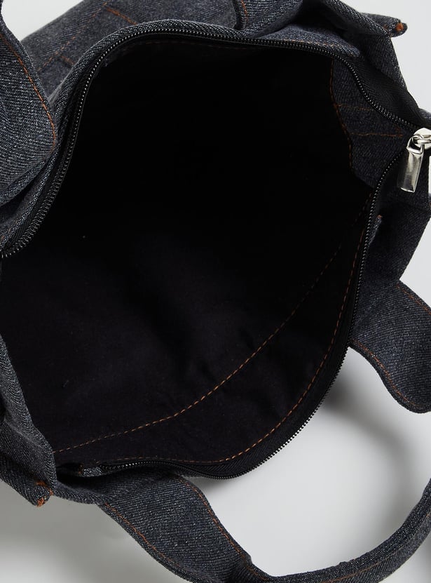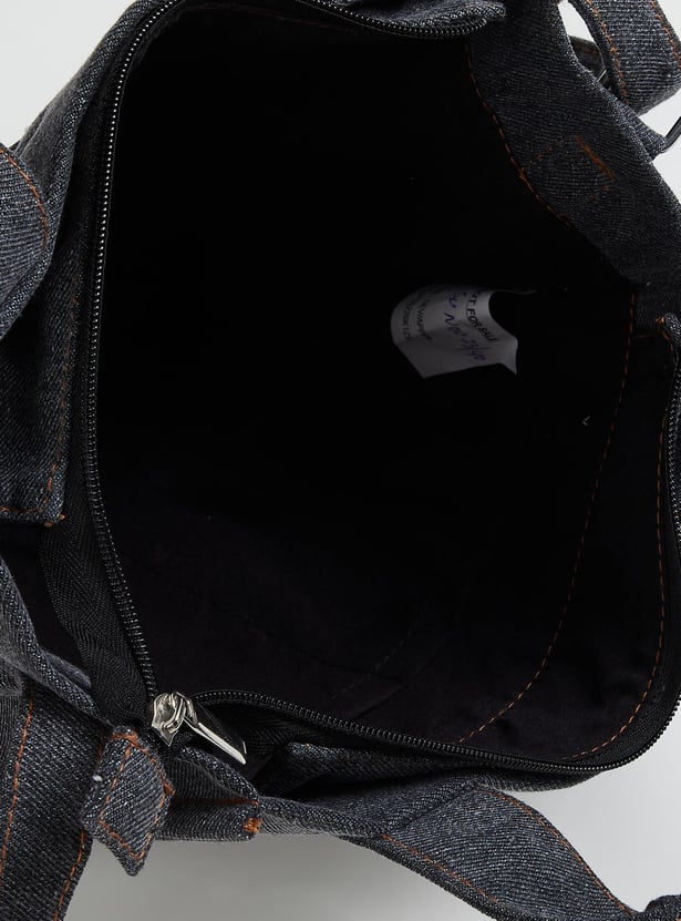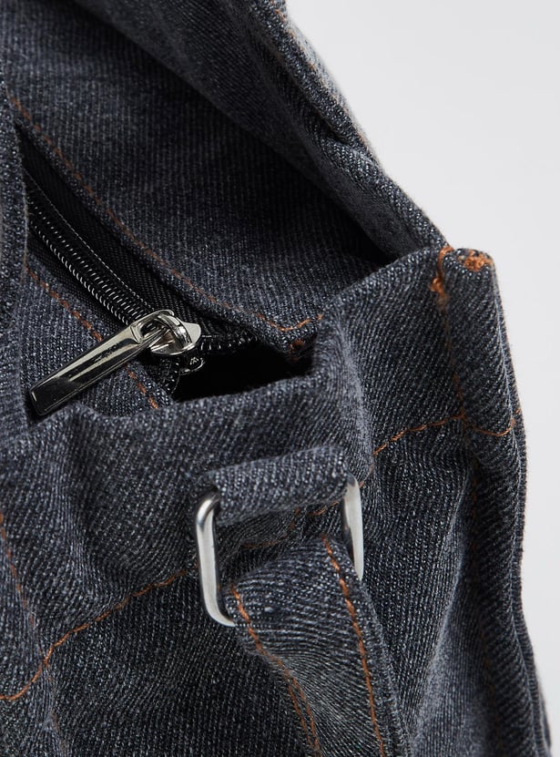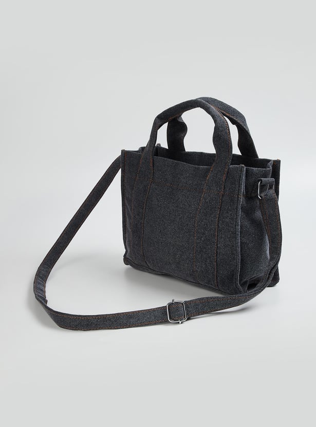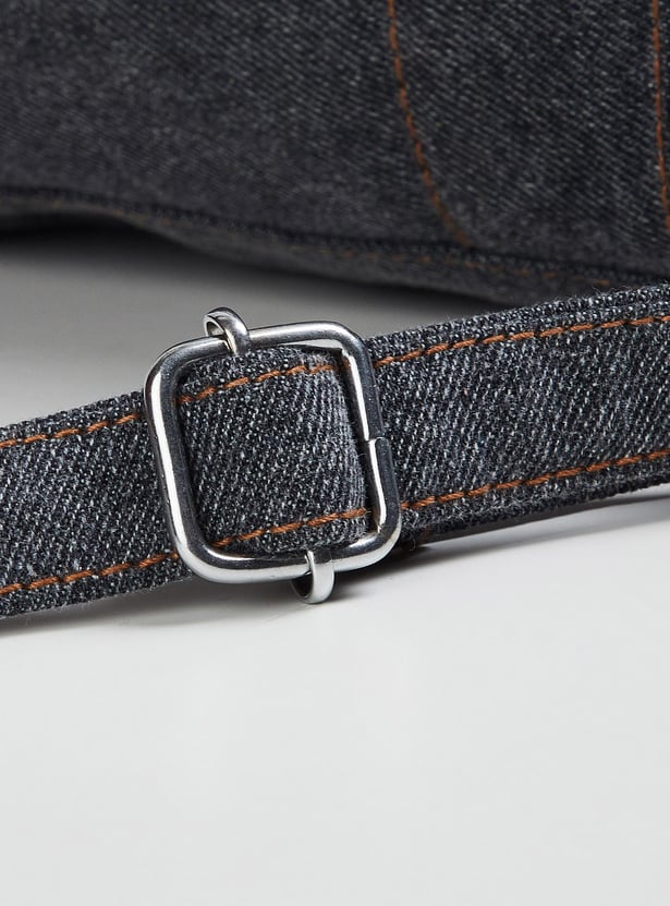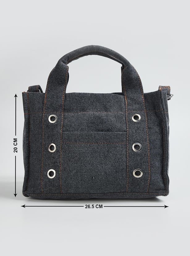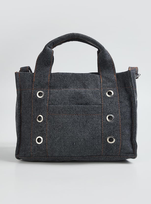 Carry your essentials in style with this bag made of denim and featuring a shoulder strap and two short handles. It has one roomy compartment with a zip top, two inner pockets, and an outer pocket. The convenience of having multiple pockets and an adjustable shoulder strap makes this sling bag ultra-stylish and user-friendly. The grommet details at the front lend an edgy look.