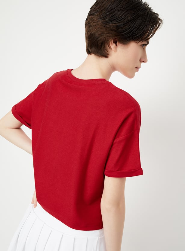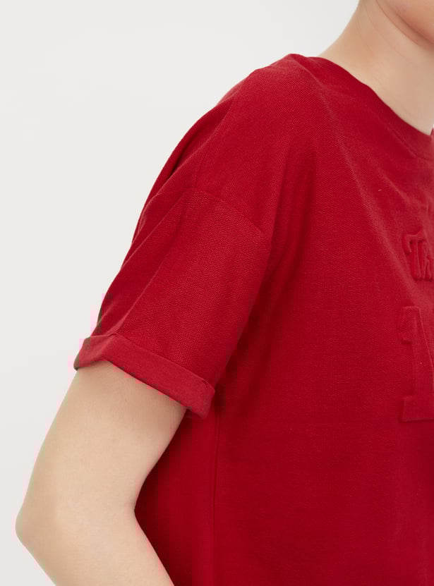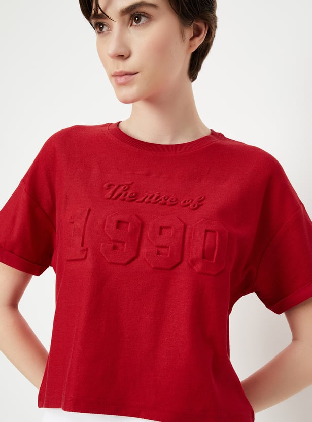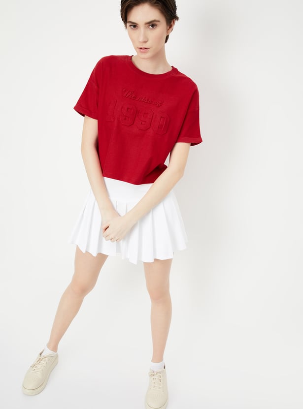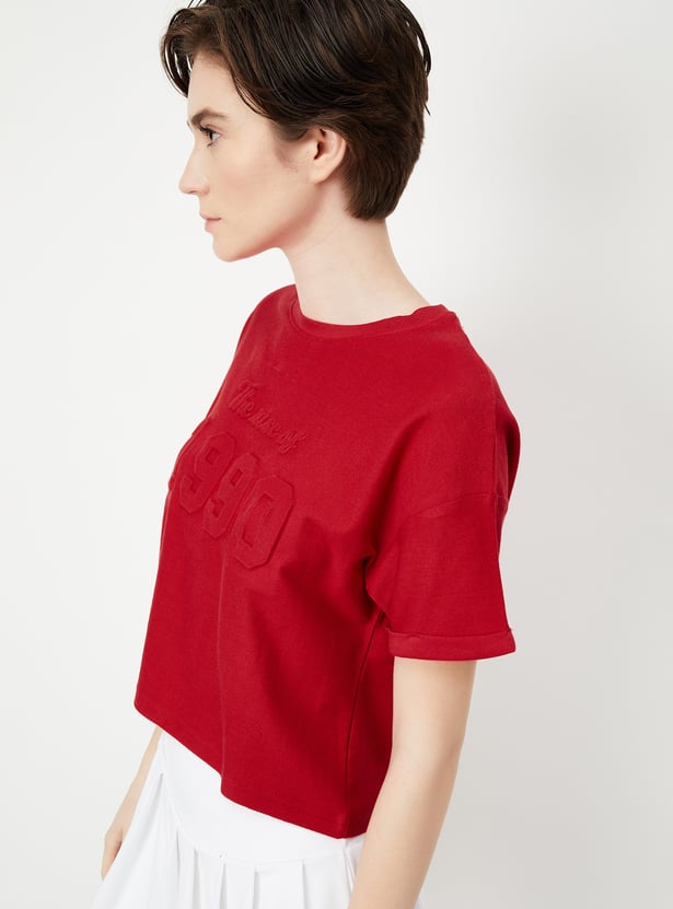 Step up your athletic style with this T-shirt, designed with a round neckline, half sleeves, and an eye-catching embossed detail on the front. The boxy, cropped fit and straight hem offer a comfortable and trendy look, making it ideal for active days and casual outings. Model Size :