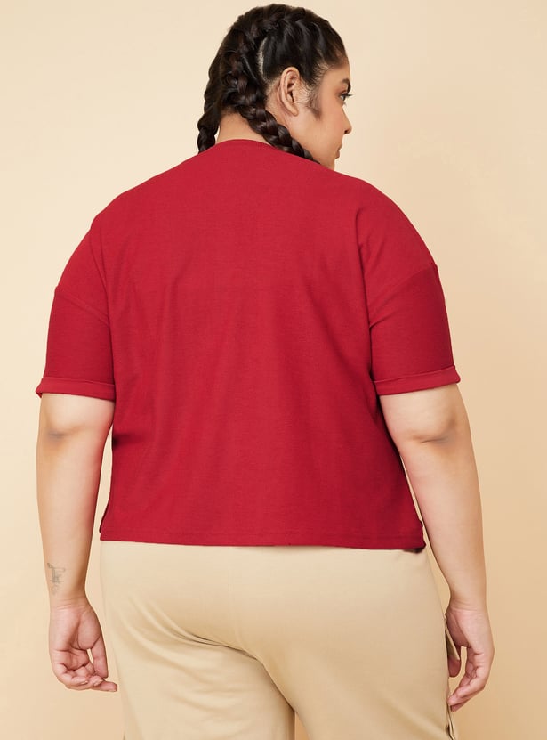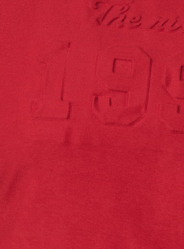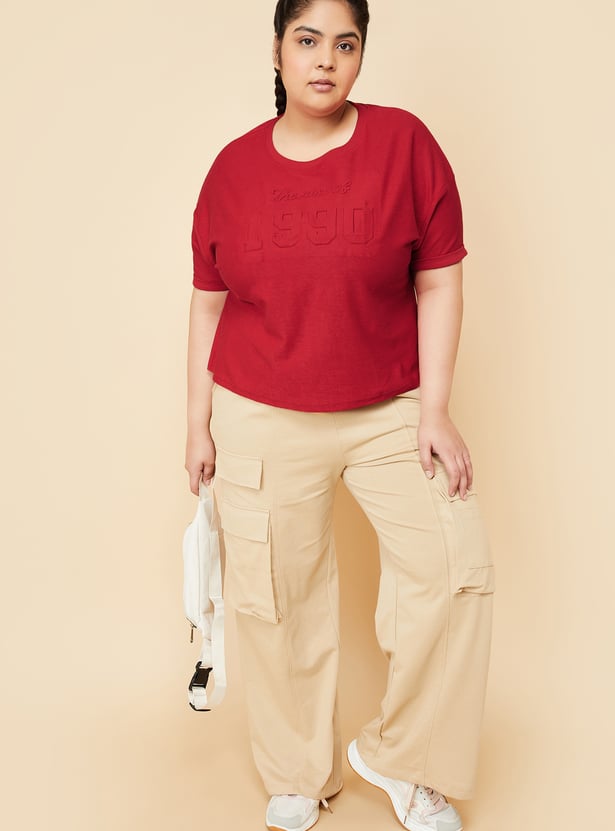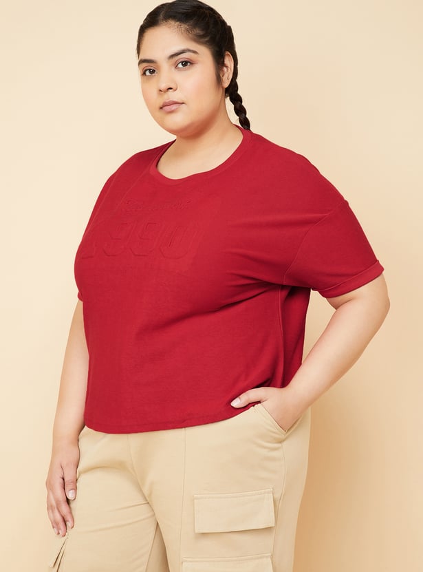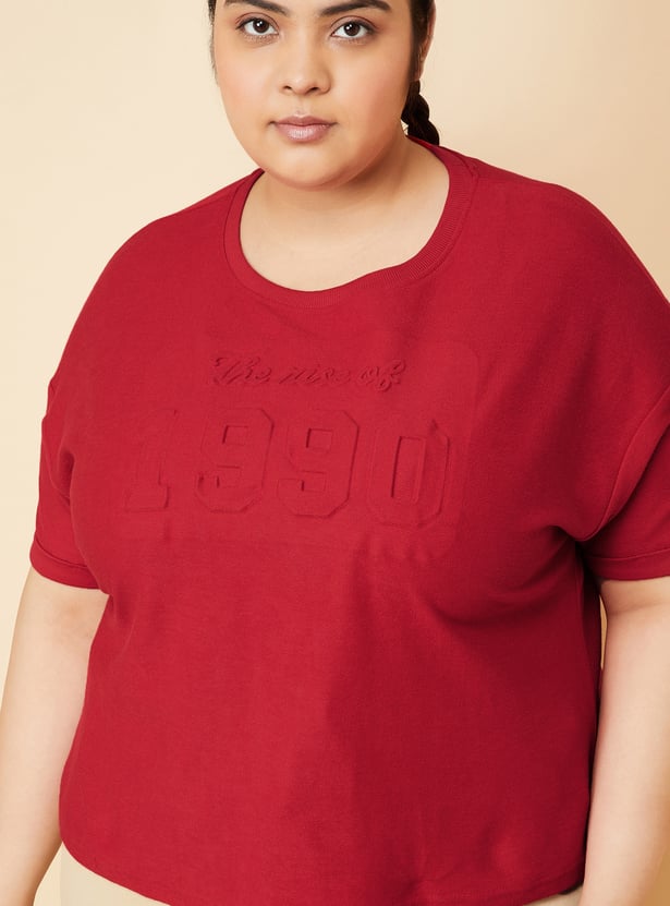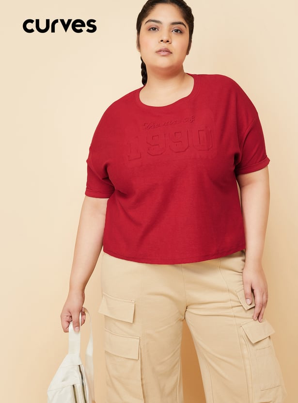 Step up your athletic style with this T-shirt, designed with a round neckline, half sleeves, and an eye-catching embossed detail on the front. The boxy, cropped fit and straight hem offer a comfortable and trendy look, making it ideal for active days and casual outings. Model Size :