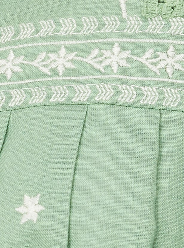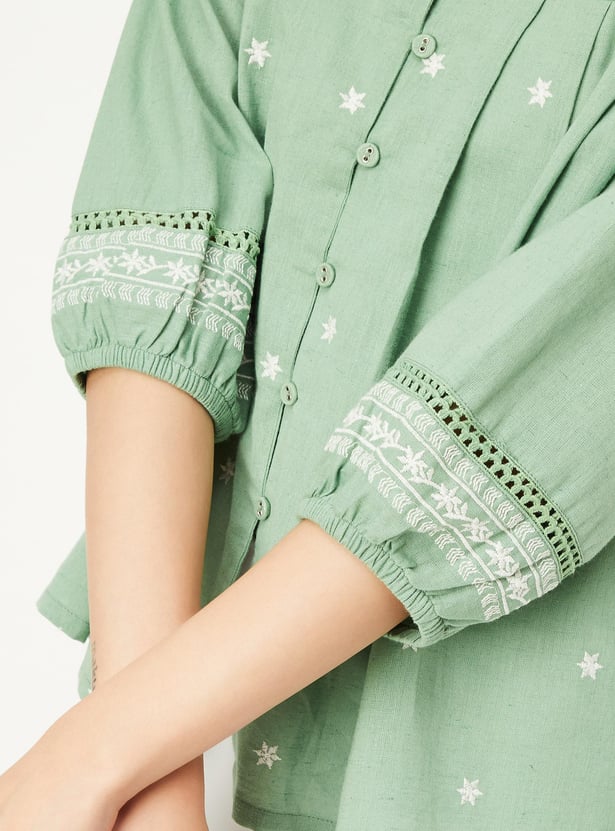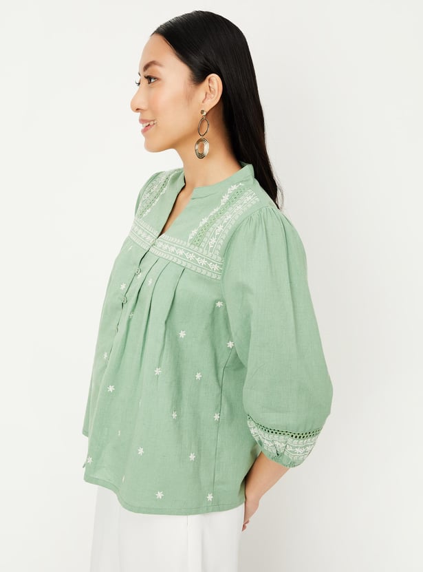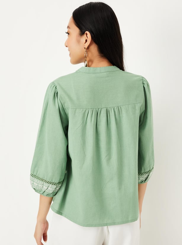 Paint a picture of elegance in this blouse. It is updated with a band collar, blouson sleeves, pleated detailing at the front, and a front button placket. The contrast embroidery and crochet insets add to the allure. Model Size :
