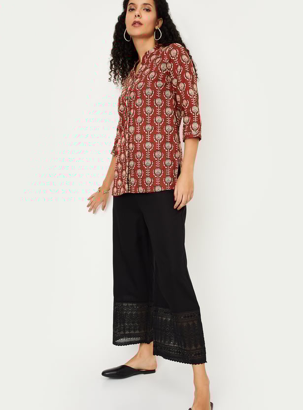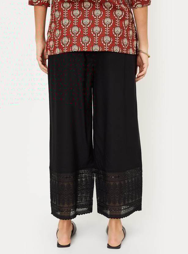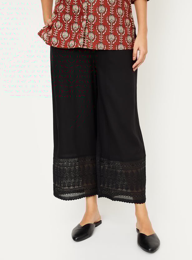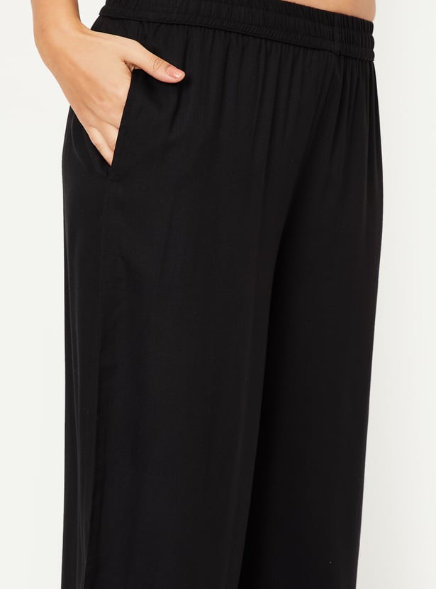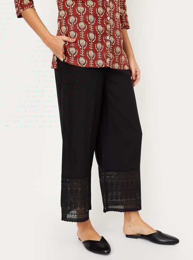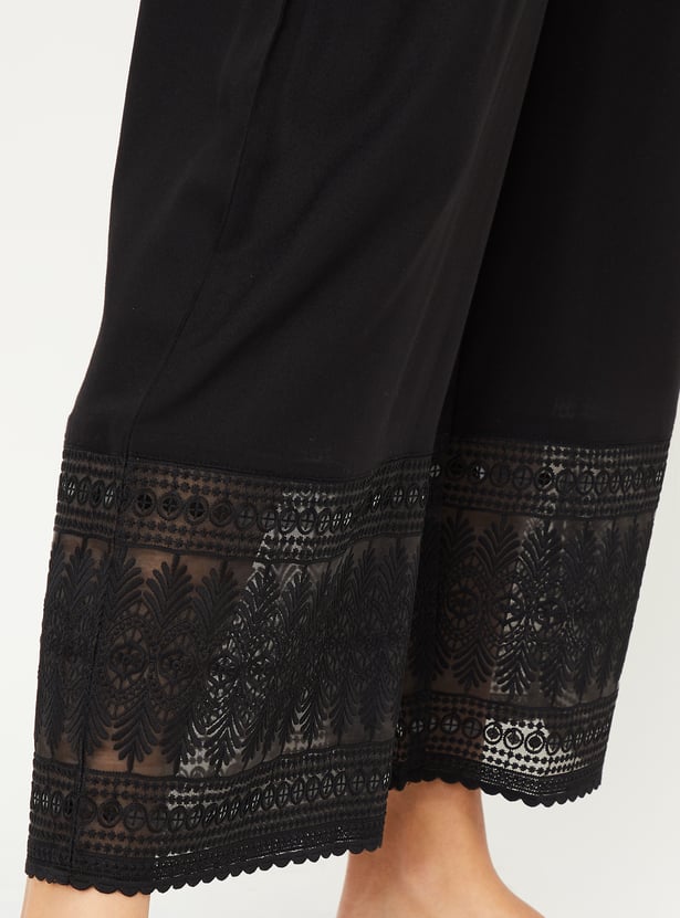 These elegant palazzos feature intricate embroidery at the hem, side pockets, and a comfortable elasticated waistband perfect for effortless everyday style.