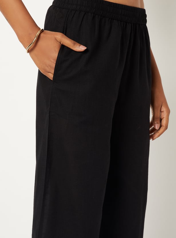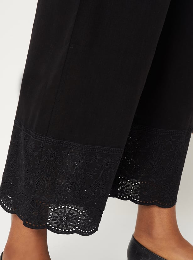 Stay comfortable and stylish with these embroidered hem palazzos, featuring a mid-rise elasticated waist and functional pockets for ease of wear. The delicate hem embroidery adds a subtle, elegant touch.