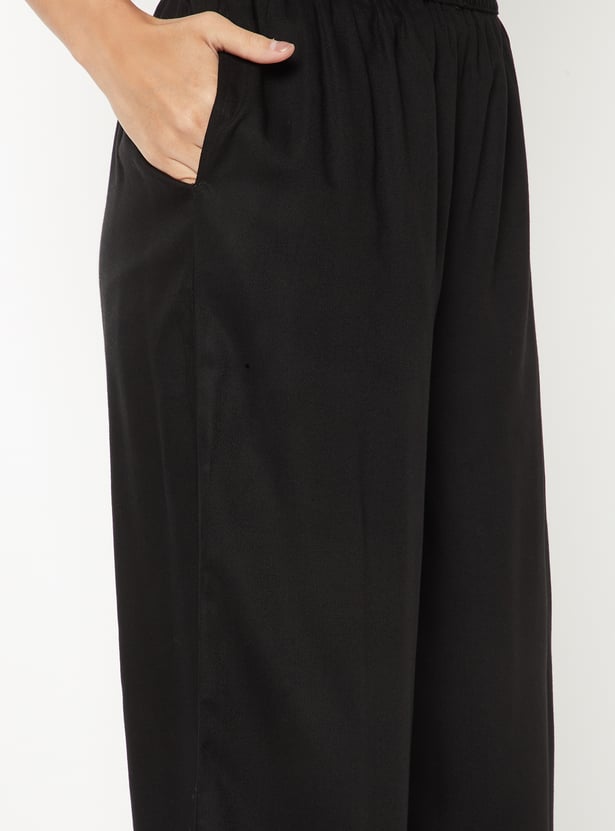 These elegant palazzos feature intricate embroidery at the hem, side pockets, and a comfortable elasticated waistband perfect for effortless everyday style.