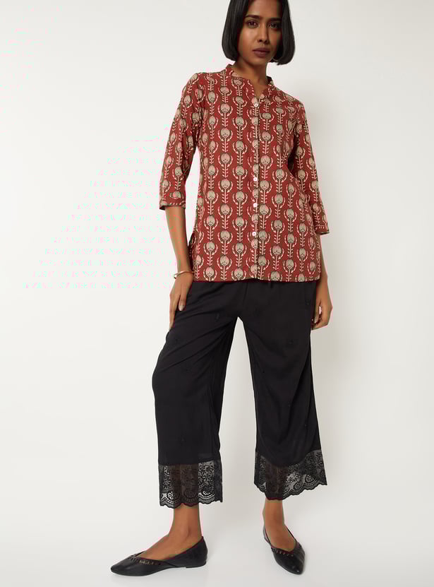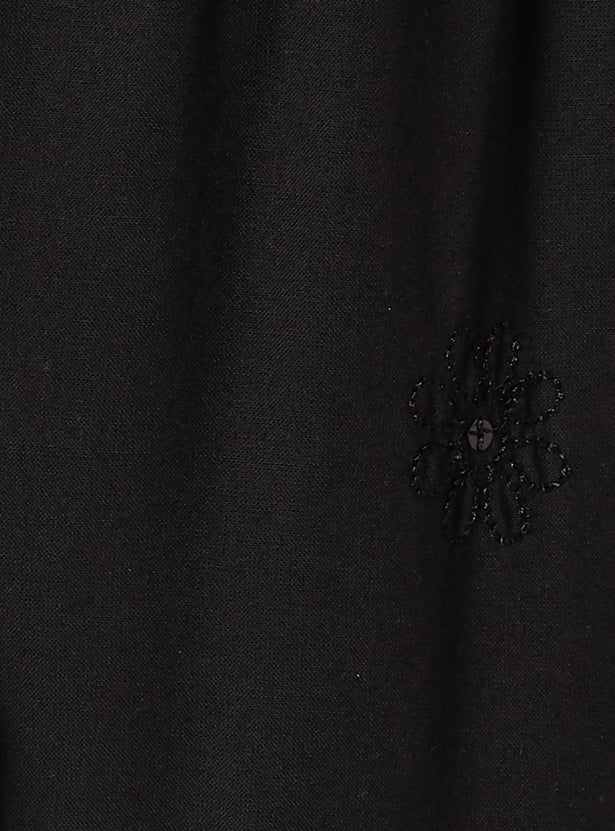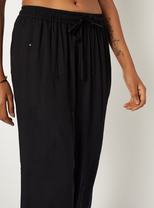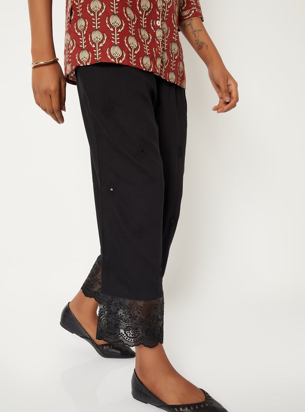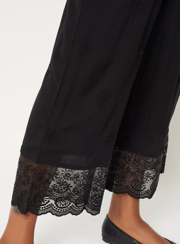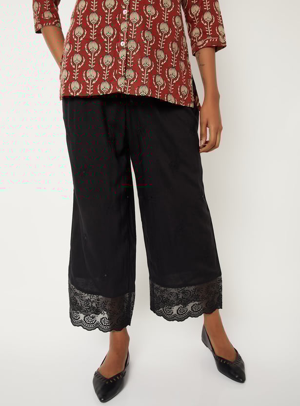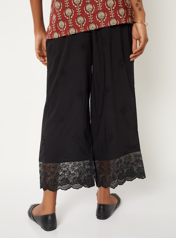 Breeze through the day in style with these palazzos, featuring an elasticated waist for comfort, side pockets, an embroidered design, and a lace scalloped trim at the hem.