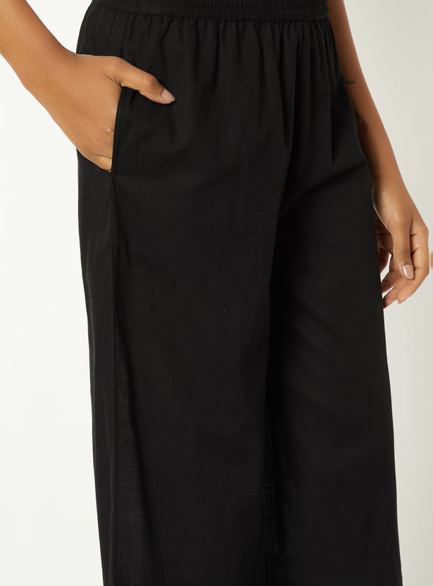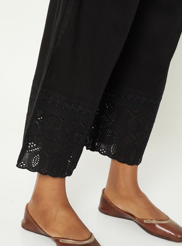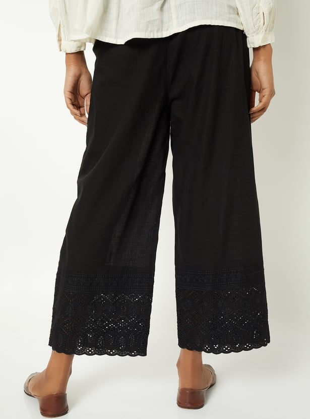 Breeze through the day in style in this pair of palazzos. It features an elasticated waist, side pockets, an embroidered panel, and a scalloped trim at the hem.