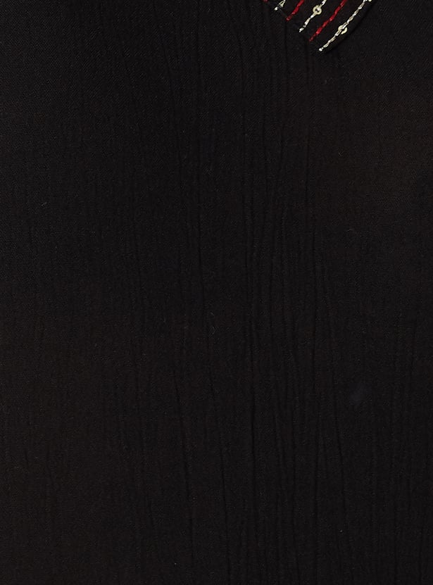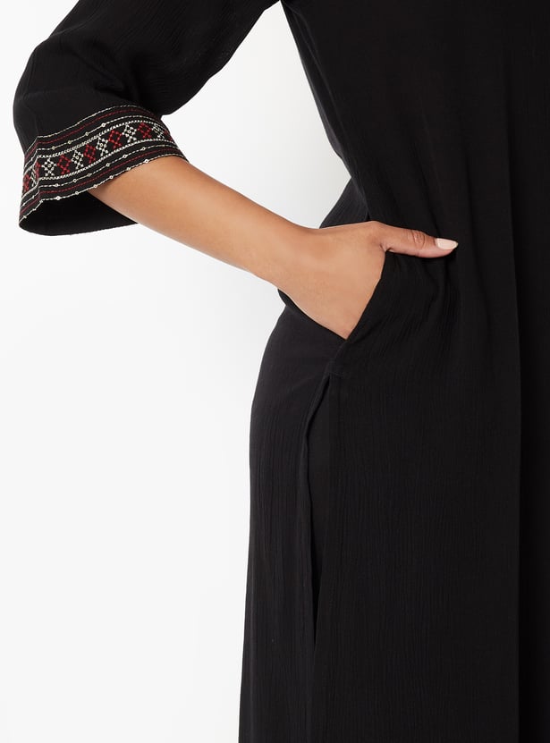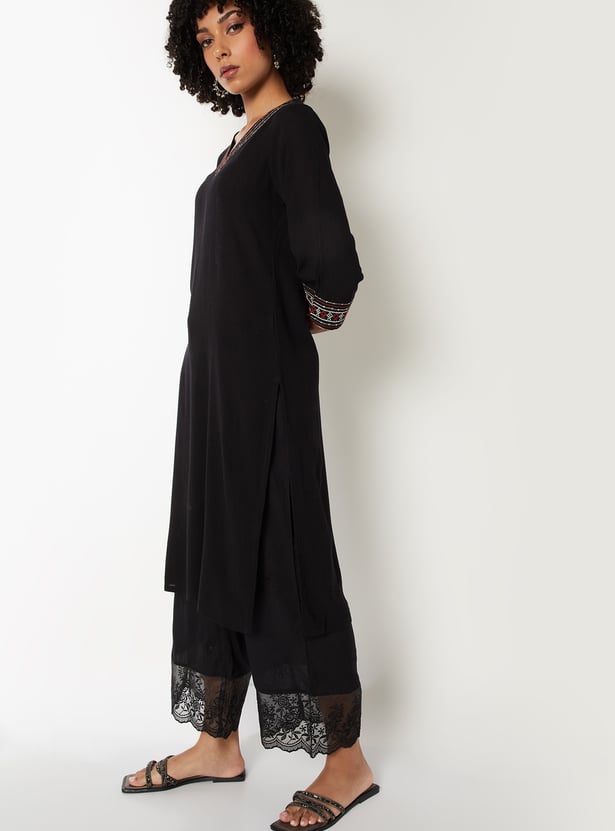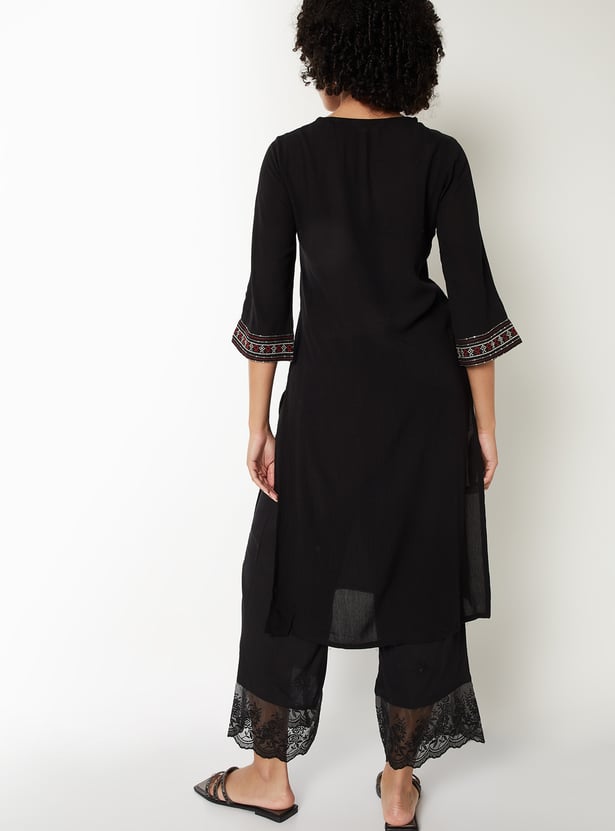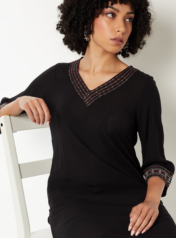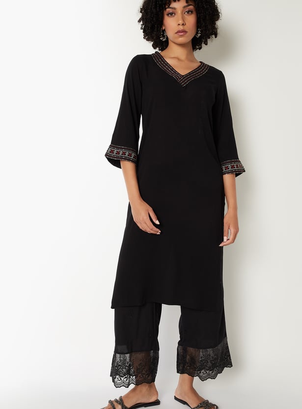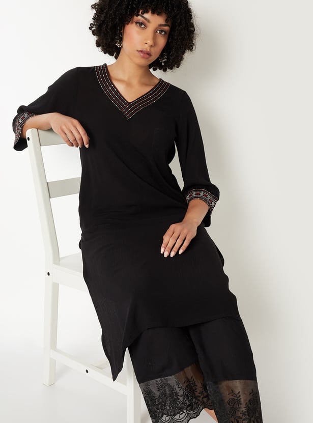 A stunning addition to your ethnic wardrobe, this kurta features a V-neck with embroidery detailing, side pocket, three-quarter sleeves, and knee-length construction. Perfect for any occasion, it combines traditional charm with contemporary style.